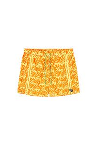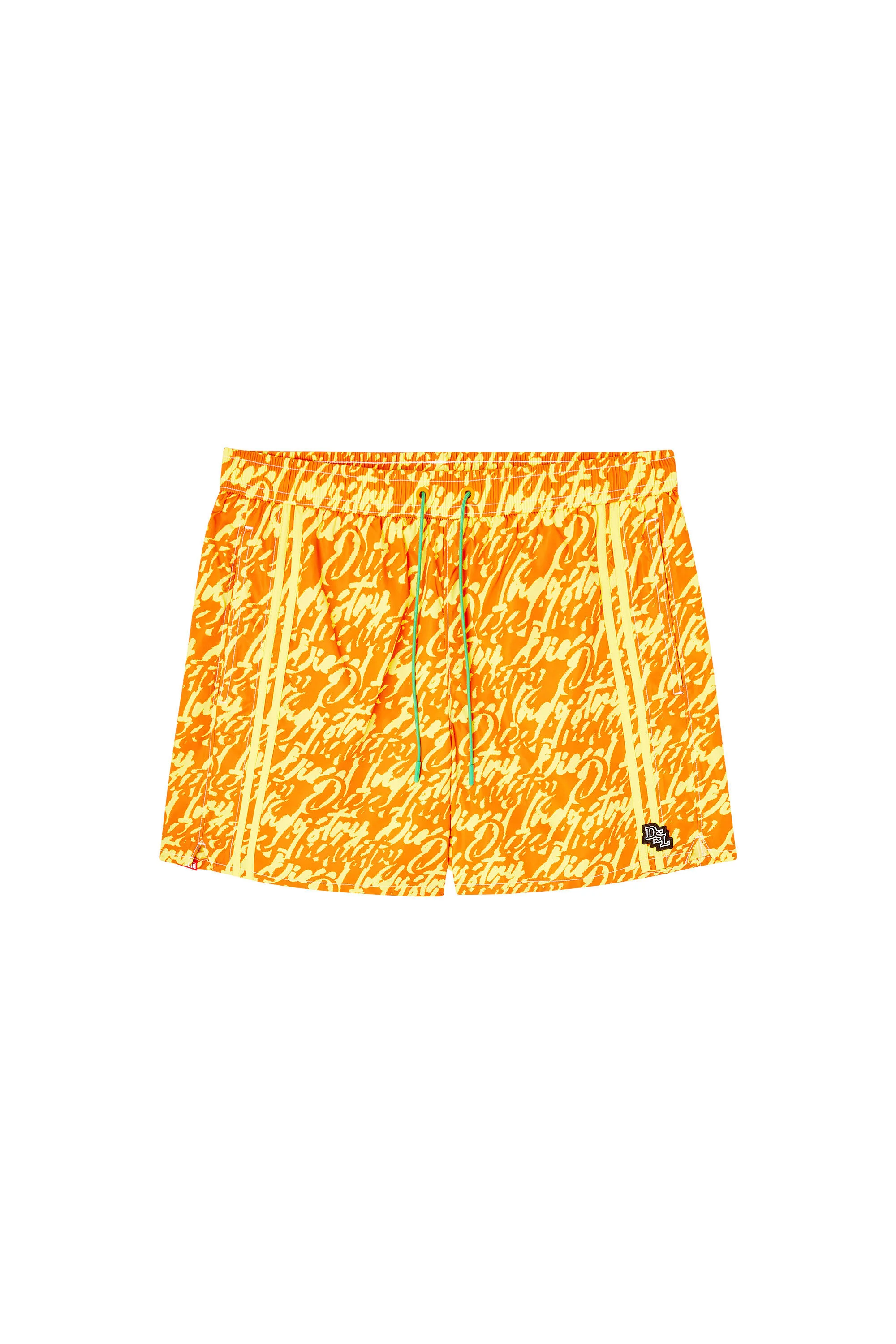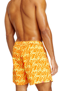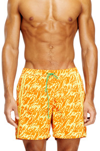 Product Description Medium-length swimming trunks made of recycled nylon with mesh pocket lining. The shorts feature an all-over graphic print that interprets the Diesel logo in fluid lettering. Complete with a contrasting drawcord with branded rubber tips, a signature rubber eyelet at the center front, and two solid side stripes for a sporty twist. A DSL patch is embroidered at the front left hem. ID: A205260EGDN Size & Fit Model is wearing a size L and is 182 cm / 5'10'' Check the size chart to choose the correct size. Materials & Details Composition: 100%Polyester Drawstring waist Side pockets Lined