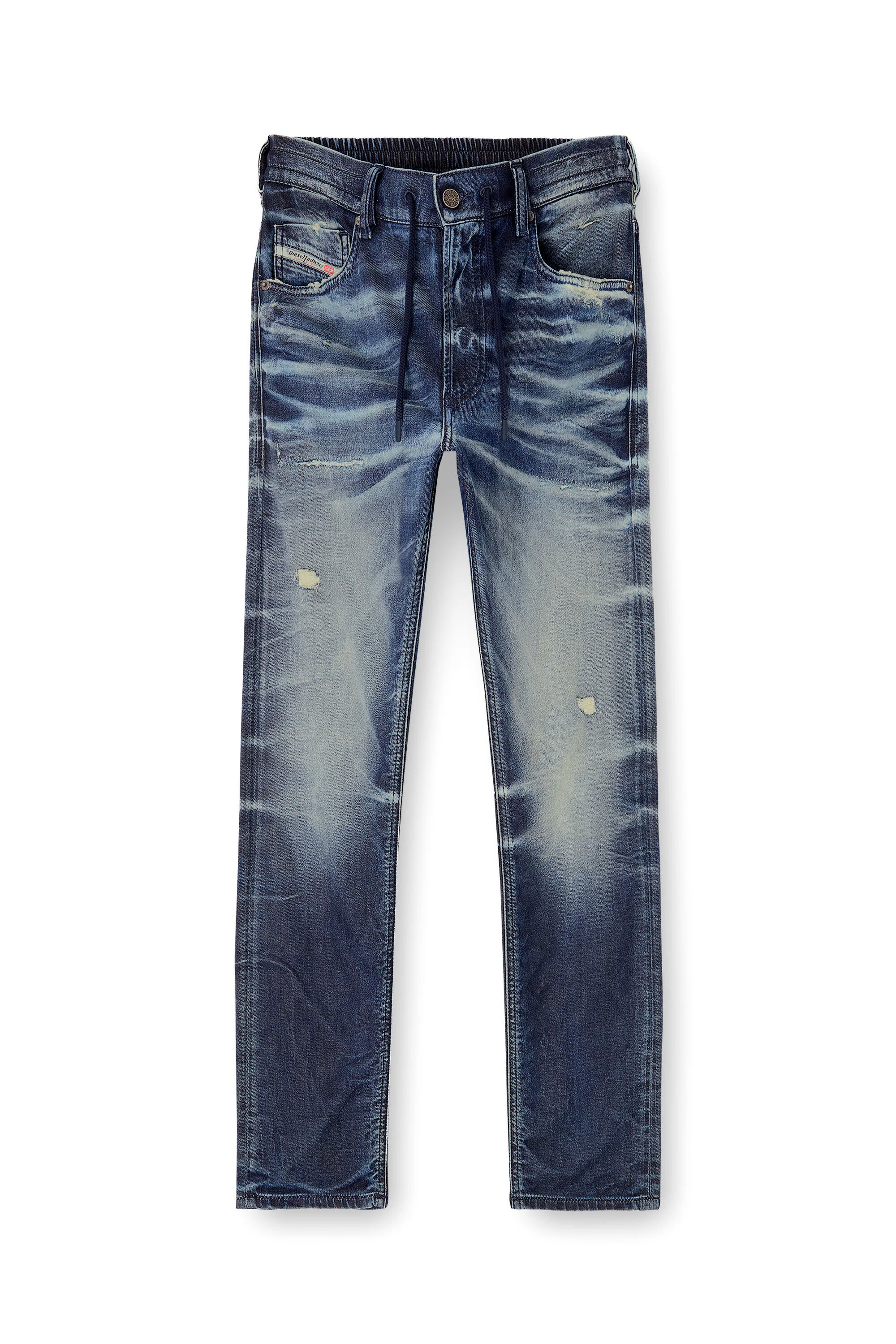 Product Description Regular fit with a medium waist and tapered leg that narrows at the ankle. Zip closure. Crafted from JoggJeans for the utmost comfort, the jean is detailed with a tonal drawstring on the waistband. The dark blue wash celebrates Diesel’s DNA with a treated look that's skillfully engineered to stand out, blending innovative comfort with authentic character. Hand-shaped 3D creases and abrasions add texture, while manually sanded whiskers with distinctive pinched details enhance the lived-in look. Made with 60% organic cotton. ID: A14847068UD Size & Fit Model is wearing a size 32 and is 182 cm / 5'10'' Check the size chart to choose the correct size. Materials & Details Composition: 98%Cotton 2%Elastane-Spandex Fit: Regular Waist: Mid Wash: Treated Fabric: JoggJeans Closure: Zip fly
