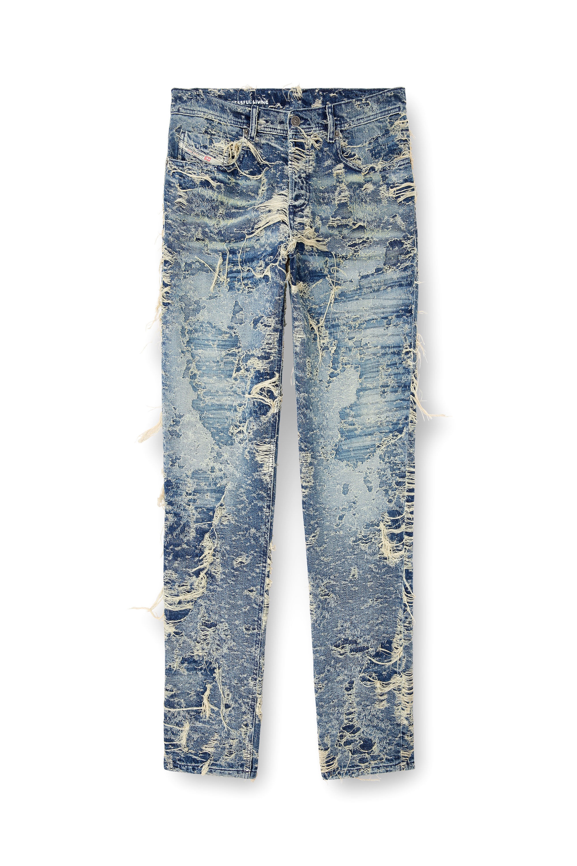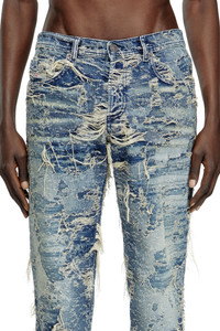 Product Description Regular fit with a medium waist and slightly tapered leg, fastened with a button fly. Roomy without being too loose, this versatile silhouette is both effortless and iconic. This Spring Summer 2025 Runway wash is crafted from fix denim using 100% organic cotton. The double loom jacquard weave replicates Diesel's signature distressed and destroyed aesthetic through an interplay of warp and weft threads. The dark blue fabric is then stonewashed and lasered to create random floating threads. Each piece has a unique design: the rips and distressing are artfully positioned to complement each style. ID: A1916009M04 Size & Fit Model is wearing a size 32 and is 182 cm / 5'10'' Check the size chart to choose the correct size. Materials & Details Composition: 100%Cotton Fit: Regular Waist: Mid Wash: Treated Fabric: Non-Stretch Closure: Button fly