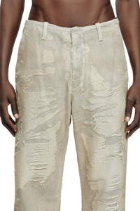 Product Description Relaxed fit with a medium waist and wide leg. The waistband and pocket construction is inspired by sartorial pants, channelling Diesel's alternative take on tailoring. Zip fly. An example of Diesel's raw yet refined approach to denim, this Spring Summer 2025 Runway wash is entirely distressed in Italy. Tapping the theme of finding beauty in what is destroyed, this jacquard denim is woven from organic cotton using a double loom; laser techniques bring out the warp and weft, creating micro fringes and short floating threads that look like they're peeling off from the fabric. Finishing treatments lend the look its unique light-grey bleached hue and "spider web" effect. ID: A18197007AU Size & Fit Model is wearing a size 32 and is 182 cm / 5'10'' Check the size chart to choose the correct size. Materials & Details Composition: 100%Cotton Fit: Relaxed Waist: Mid Wash: Treated Fabric: Non-Stretch Closure: Zip fly