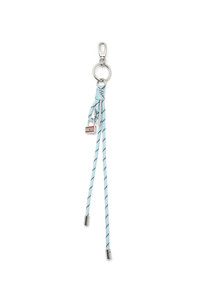 Product Description This keyring charm features a bicolour cord with metallic tips, knotted around a D-shaped metal detail. The lobster clasp, engraved with Diesel lettering, allows for easy attachment to bags, keys or accessories. ID: X10802P9138 Materials & Details Composition: 50%Polyester 40%Zinc 10%Iron Metal lobster clasp closure Silver-toned D-shaped detail with knot