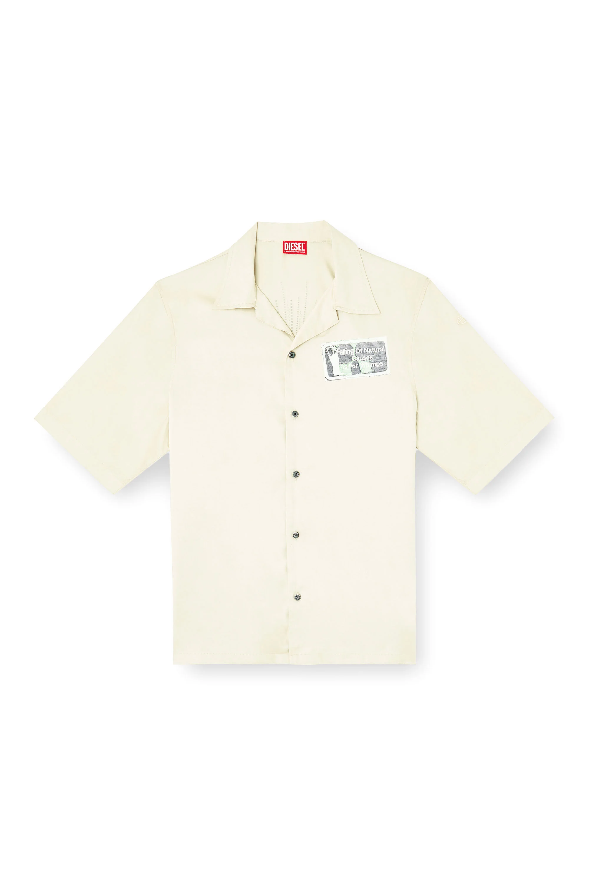Product Description Part of an artistic collab, this men's beige bowling shirt is a fusion of medieval inspo and modern creativity: note the slogan on the chest and the rhinestone-encrusted graphic on the back. Its regular-fitting silhouette hangs fluidly in TENCEL™ Lyocell. ID: A195550EPBR Size & Fit Model is wearing an IT size 48 and is 188 cm / 6'2" Check the size chart to choose the correct size. Materials & Details Composition: 100%Lyocell, Application 100%Glass Regular fit Button closure