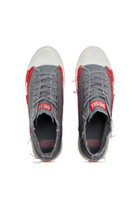 Product Description A high-top style, these men's canvas sneakers feature a bold take on Diesel's iconic red D logo. The originally tiny emblem is rendered in a dual fabric and rubber design that's split between the upper and sole in blown-up proportions. The shoes are frayed and hand-distressed with dirty-effect smudging, lending them a worn, beaten-up feel. ID: Y03505P8114 Materials & Details Composition: 100%Cotton Lace-up Rubber toe cap Vulcanised rubber sole with red tread