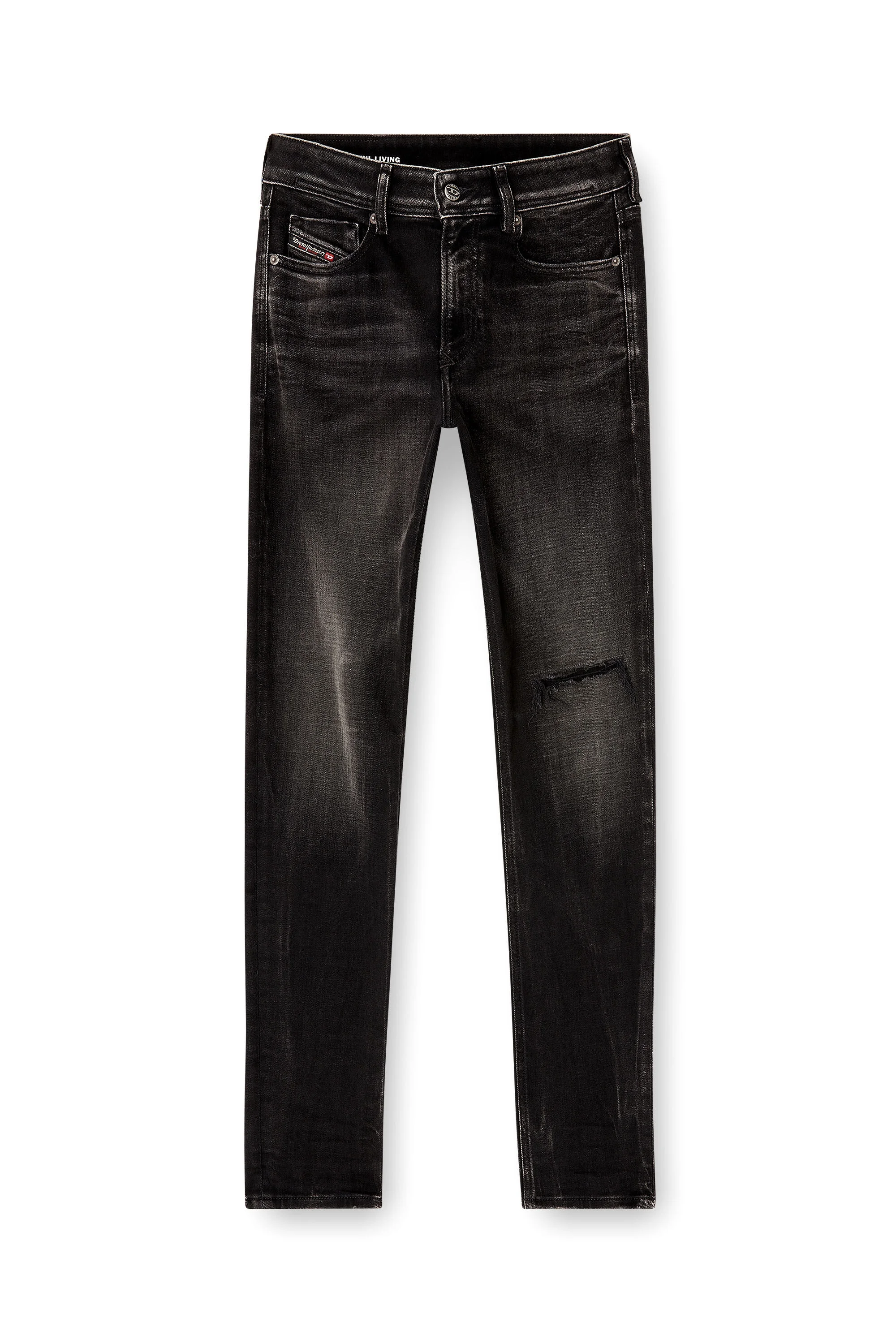 Product Description Skinny fit with a low waist and a long, narrow leg from thigh to ankle, cut for the perfect amount of bunching in the leg. A subtle example of Diesel's iconic destroyed aesthetic, this black wash is crafted from stretch denim in organic cotton. Part of the brand's DNA selection, it's characterised by artful ripped details, carefully mended from the inside with tonal patches and hand-trimmed on the outside. Shaded whiskers complete the distinctive lived-in look. ID: A0359409N19 Size & Fit Model is wearing a size 32 and is 182 cm / 5'10'' Check the size chart to choose the correct size. Materials & Details Composition: 95%Cotton 3%Polyester 2%Elastane-Spandex Fit: Skinny Waist: Low Wash: Destroyed Fabric: Stretch Closure: Zip fly