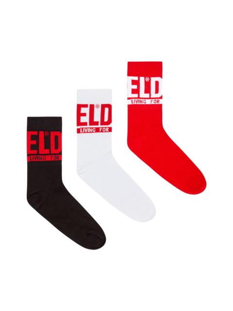 Product Description Three-pack of men's socks made from stretch organic cotton. Each is embellished with a jacquard Diesel For Successful Living logo on the cuff. ID: 00SAYJ2QATV Size & Fit Model is wearing a size L and is 182 cm / 5'10'' Check the size chart to choose the correct size. Materials & Details Composition: 51%Cotton 26%Polyamide-Nylon 12%Polyester 8%Elastodiene 3%Elastane-Spandex Set of 3 pairs Ribbed cuffs