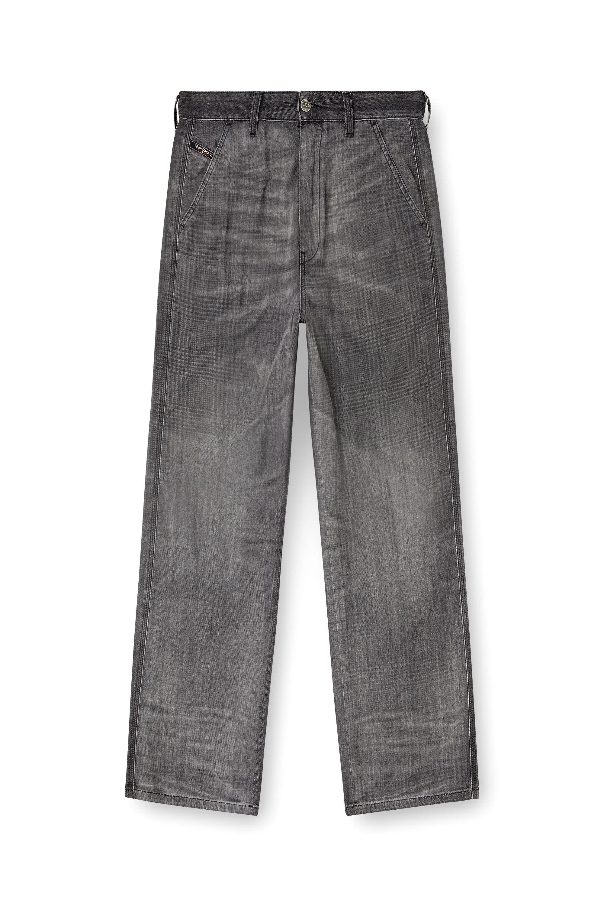 Product Description Regular fit with a medium waist and straight leg. Slant pockets and an ironed crease on the front nod to classic chino silhouettes. Button fly. Made from a blend of organic cotton and TENCEL™Lyocell, this fix denim fabric is smooth and fluid. The grey wash combines a traditional Prince of Wales pattern with carefully designed whiskers where the garment naturally folds when worn. A final spray technique intensifies the tonal contrasts. ID: A20265068UJ Materials & Details Composition: 50%Cotton 40%Lyocell 10%Modal Fit: Regular Waist: Mid Wash: Treated Fabric: Non-Stretch Closure: Button fly