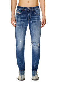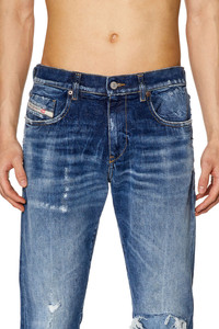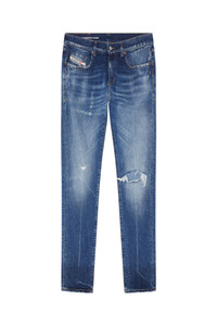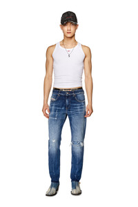 Model is tall 188 cm / 6'2", the waist measures 75 cm / 29" Fits true to size, take your normal size. Slim style with a clean construction and essential details. This versatile jean features a comfortable silhouette, finished with a zip fly. Part of Diesel Rehab Denim, this garment is crafted using fully recycled cotton, including Diesel's denim scraps, and fully recycled elastane, treated with low impact processes to reduce water and chemical use. It features a comfort medium blue wash with a vintage look and feel, obtained with a special ozone-dyeing technique and enhanced by ripped and repaired details on the pockets and knees.