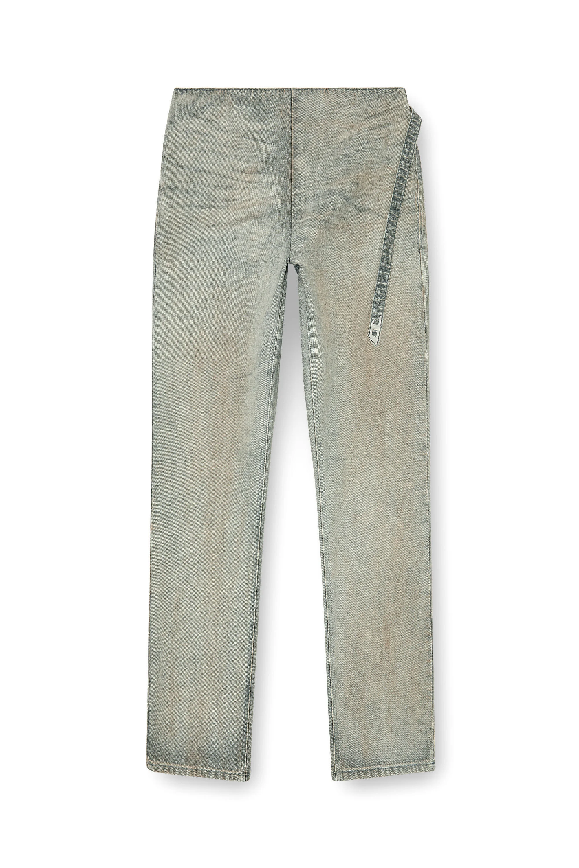 Product Description Slim fit with a medium waist, defined by a deconstructed front that morphs into a self-tie belt. Finished with additional belt loops and a metal D logo at the tip of the belt, this Runway Show jean leans into the biker aesthetic. Channeling an elevated worn-in look in shades of grey, this garment is crafted from Diesel's innovative satin denim in cotton and hemp, with a refined, luminous surface thanks to an injection of metallic yarn. Laser treatments add bold contrast between glossy and matte areas, while a manual spray coating and sulphur-based pigments create faded, dirt-like effects. The metal button features a concave Diesel “D” logo encased in transparent resin for a jewel-like finish. An embossed leather back patch completes the design. ID: A2245109P24 Size & Fit Model is wearing a size 32 and is 182 cm / 5'10'' Check the size chart to choose the correct size. Materials & Details Composition: 80%Cotton 20%True Hemp, Contrast 100%Lyocell Fit: Slim Waist: Mid Wash: Coated Fabric: Non-Stretch Closure: Zip fly