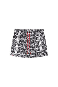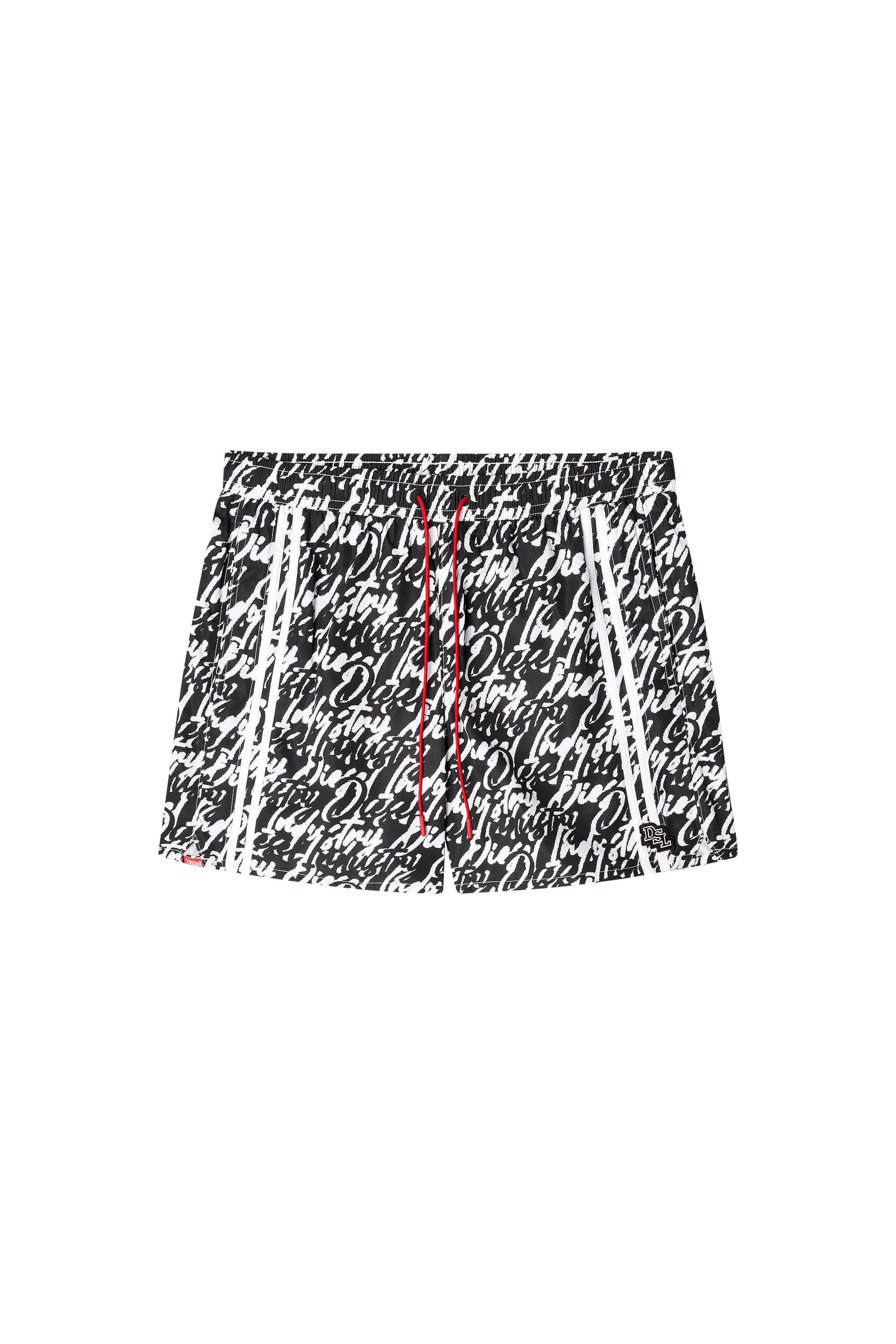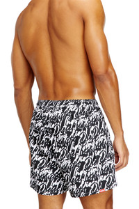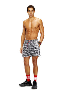 Product Description Medium-length swimming trunks made of recycled nylon with mesh pocket lining. The shorts feature an all-over graphic print that interprets the Diesel logo in fluid lettering. Complete with a contrasting drawcord with branded rubber tips, a signature rubber eyelet at the center front, and two solid side stripes for a sporty twist. A DSL patch is embroidered at the front left hem. ID: A205260EGDN Size & Fit Model is wearing a size L and is 182 cm / 5'10'' Check the size chart to choose the correct size. Materials & Details Composition: 100%Polyester Drawstring waist Side pockets Lined
