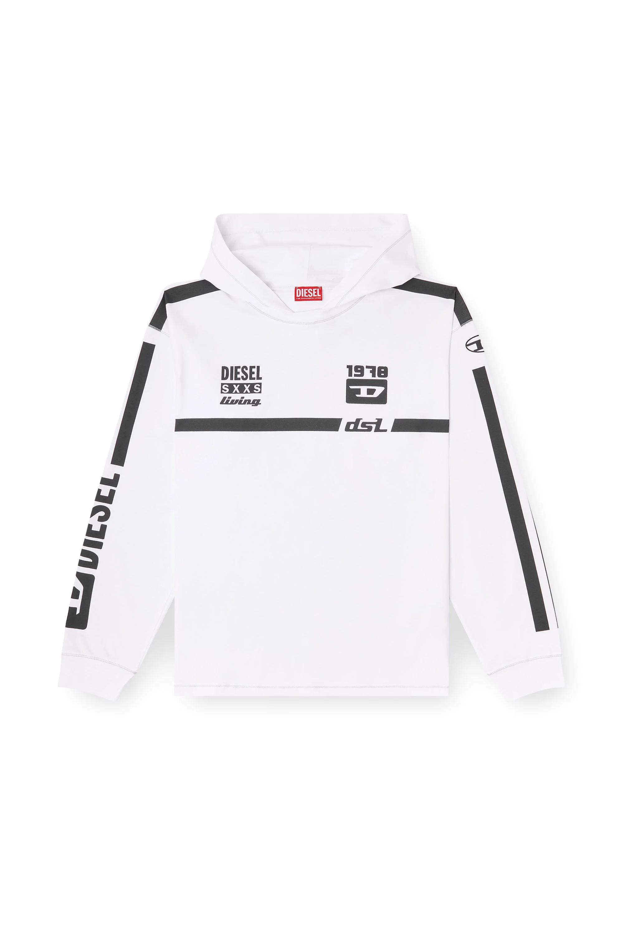 Product Description Men's long-sleeve T-shirt made from soft jersey in organic cotton. The relaxed-fit silhouette features stretchy ribbed trims on the cuffs and contrasting graphic prints on the front, shoulders and sleeves, including multiple Diesel logo details, inspired by sporty racing styles. ID: A220030ALBV Size & Fit Model is wearing a size L and is 182 cm / 5'10'' Check the size chart to choose the correct size. Materials & Details Composition: 100%Cotton Relaxed fit Hood Contrast prints