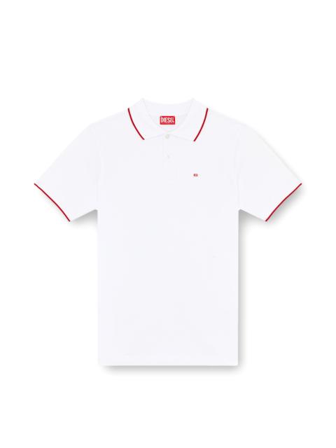 Product Description This men's polo shirt is styled for a slim fit. Cut from organic cotton pique, it's accented with stripes on the collar and cuffs. Subtly embellished with a micro-embroidered Diesel logo on the left chest. ID: A150330JMAD Size & Fit Model is wearing a size L and is 182 cm / 5'10'' Check the size chart to choose the correct size. Materials & Details Composition: 100%Cotton Slim fit Button placket Knitted collar and cuffs