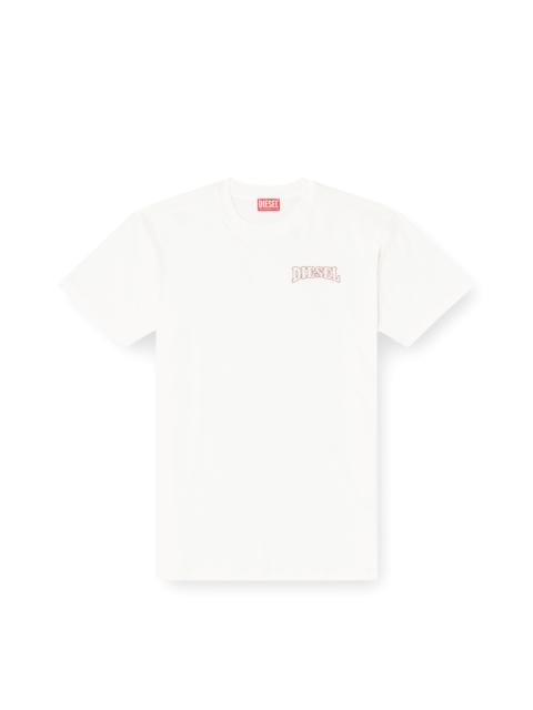 Product Description Men's T-shirt with a crew neck and short sleeves, made from organic cotton jersey with a regular fit. Featuring a Diesel embroidery on the left chest and a subtle Diesel logo flag on the side for a minimalist yet signature look. ID: A220060PLAT Size & Fit Model is wearing a size L and is 182 cm / 5'10'' Check the size chart to choose the correct size. Materials & Details Composition: 100%Cotton Regular fit Crew neck