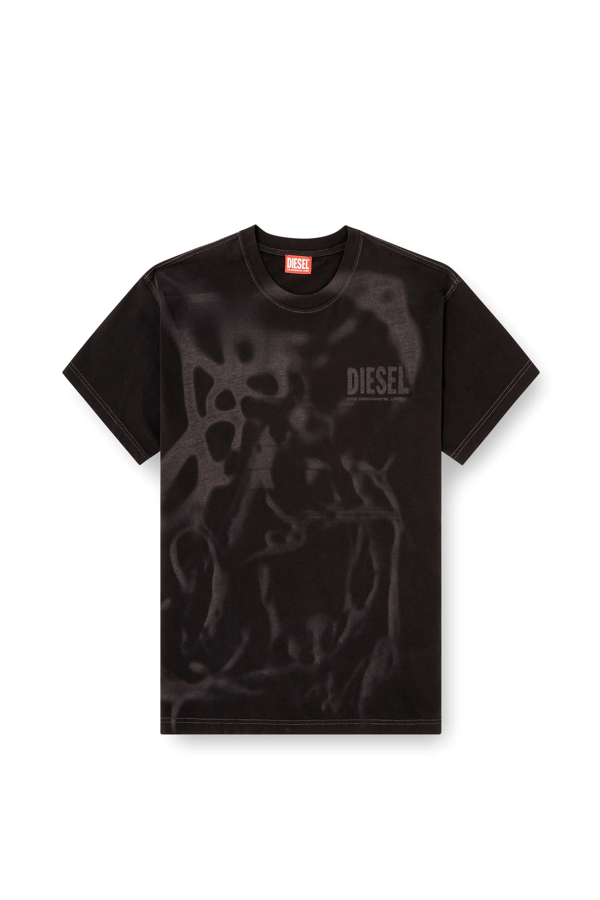 Product Description Crew neck T-shirt with short sleeves and a regular fit. Made of organic-cotton jersey, it features an all-over laser print on the front that gives the garment a distinctive look. The Diesel logo stands out on the chest, adding a touch of character and recognizability to the design. The red Diesel label is positioned on the left side. ID: A199950LJBS Size & Fit Model is wearing a size L and is 182 cm / 5'10'' Check the size chart to choose the correct size. Materials & Details Composition: 100%Cotton Regular fit Crew neck Laser print T-shirt