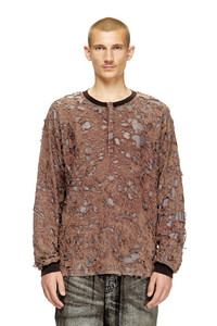 Product Description This men's long-sleeve T-shirt combines brown cotton on the outside and shiny grey fabric on the inside: the outer yarn is burnt away to create a striking peeled effect. A marble wash accentuates the lived-in look, while a button placket defined its relaxed profile. ID: A195160IKCK Size & Fit Model is wearing a size L and is 182 cm / 5'10'' Check the size chart to choose the correct size. Materials & Details Composition: Outer 100%Cotton, Inner 100%Polyester Relaxed fit Button placketCuffed sleeves