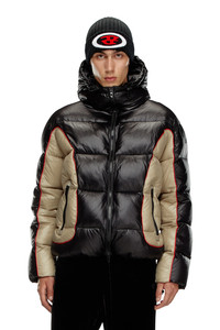 Product Description This men's quilted jacket has a cool, colour-block design outlined with piping. Fitted with drawstrings at the hood, cuffs and hem, it's made from shiny, glazed-effect recycled ripstop and filled with recycled padding that mimics down. A tonal embroidered logo accents the sleeve. ID: A144050DBCH Size & Fit Model is wearing an IT size 48 and is 188 cm / 6'2" Check the size chart to choose the correct size. Materials & Details Composition: 100%Polyamide-Nylon Drawstring hood, hem and cuffs Zip closure Zip pockets