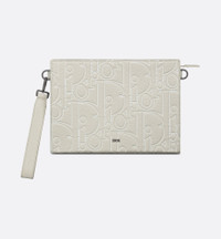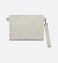 The A5 triangle pouch is a House staple. The style is made in beige Dior Gravity Outline leather, a grained calfskin embossed with the iconic House motif for a 3D effect with graphic appeal, and is enhanced by the Dior signature on the front. Its spacious zip compartment is perfect for a phone and is completed by six card slots. Thanks to its removable grained calfskin wrist strap, the pouch can be carried by hand or slipped into a bag, and will pair well with other Dior Gravity Outline creations. - Main composition: calfskin - Calfskin and technical fabric lining - Main zip compartment - Interior slip pocket - Six card slots in grained calfskin - Removable grained calfskin wrist strap - Ruthenium-finish brass Dior signature on the front - Embossed Dior signature on the interior - Dust bag included - Made in Italy/Spain Size & Fit - Dimensions: 27 x 19 x 6.5 cm / 10.5 x 7.5 x 2.5 inches (Length x Height x Width) - The main compartment's size is suitable for all phones - Weight: 460 g / 16 ounces - Size and weight details may vary depending on the product's material