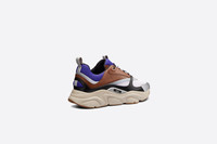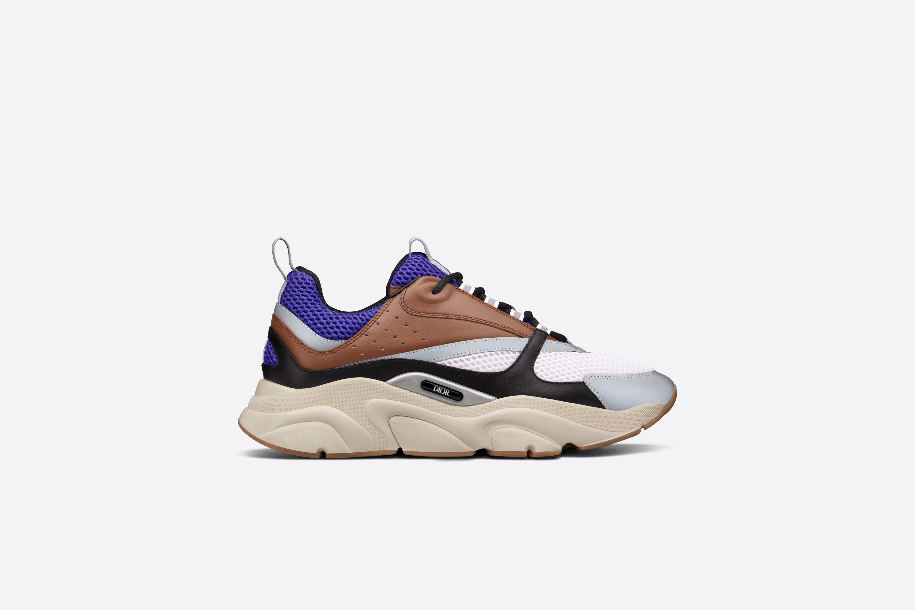 The B22 sneaker reimagines the chunky sneaker through a retro lens. Combining different materials and textures, including coffee and black smooth calfskin and violet and cream technical mesh, it has a bold, sportswear aesthetic. Round laces and a raised 'DIOR' signature on the side complement the thick, sculpted, cream rubber sole. The sneaker can be worn with any relaxed outfit for a sporty and contemporary silhouette. - Violet and cream technical mesh - Coffee and black smooth calfskin - 'DIOR' signature on the side - Low-top - Nylon tabs and lace-up closure - Nylon and calfskin lining - Cream sculpted rubber outsole with brown edging - Welded construction - Dust bag included - Made in Italy Size & Fit - The shoe runs small, please order a full size up - For more information, please review the size guide