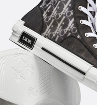 The B23 high-top sneaker superimposes transparent mesh inserts with black and white Dior Oblique-printed canvas for a standout effect. Set apart by modern design details, the shoe maintains timeless sneaker codes such as eyelets and a lace-up front, a white rubber sole, a reinforced round toe, and a rear heel tab. The sneaker is further enhanced with contrasting details on the sides, including a 'DIOR' signature. It will pair easily with any casual outfit. - Black and white Dior Oblique canvas with transparent paneling - Patchwork-effect sole with side 'DIOR' signature - Upright shaft - Lace-up closure - Microfiber lining - White rubber outsole and reinforced toe with two-tone insert - Welded, side-sewn construction - Dust bag and black laces included - Normal fit, please choose your regular shoe size - Made in Italy