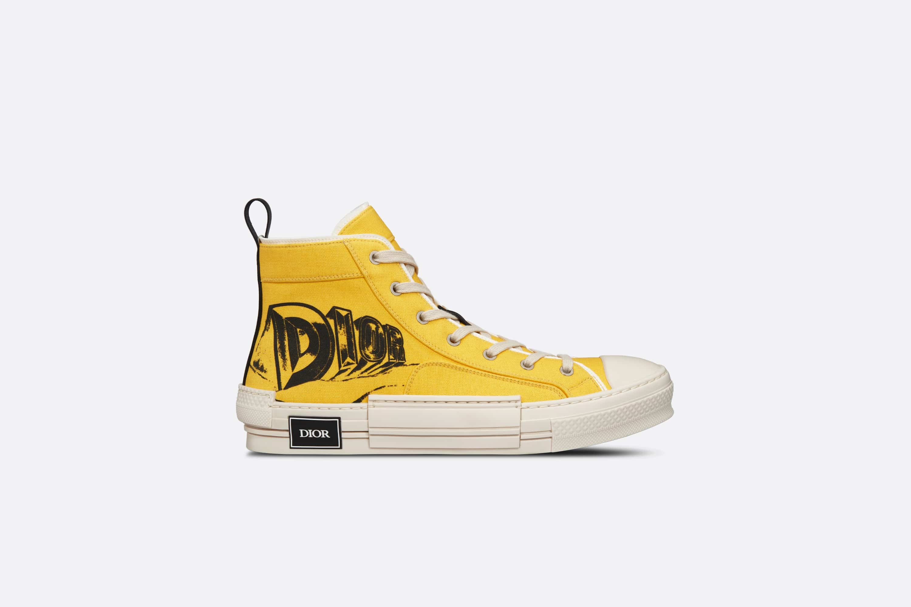 The B23 high-top sneaker is revisited by Kim Jones with a modern version in yellow canvas. Embellished with the graphic AsteroDior signature, inspired by 1970s space operas and channeling an intergalactic desert universe, it features timeless sneaker codes such as eyelets and a lace-up front, a cream-colored rubber sole with the Dior signature, a reinforced rounded toe and a tab at the back. The sneaker will pair easily with any casual attire. - Yellow canvas with AsteroDior signature - Patchwork-effect sole with Dior signature - High-top - Lace-up closure with rear tab - Calfskin lining - Cream rubber outsole - Welded, side-sewn construction - Dust bag included - Made in Italy Size & Fit - The style fits true to size: we recommend ordering your normal shoe size - For more information, please review the size guide
