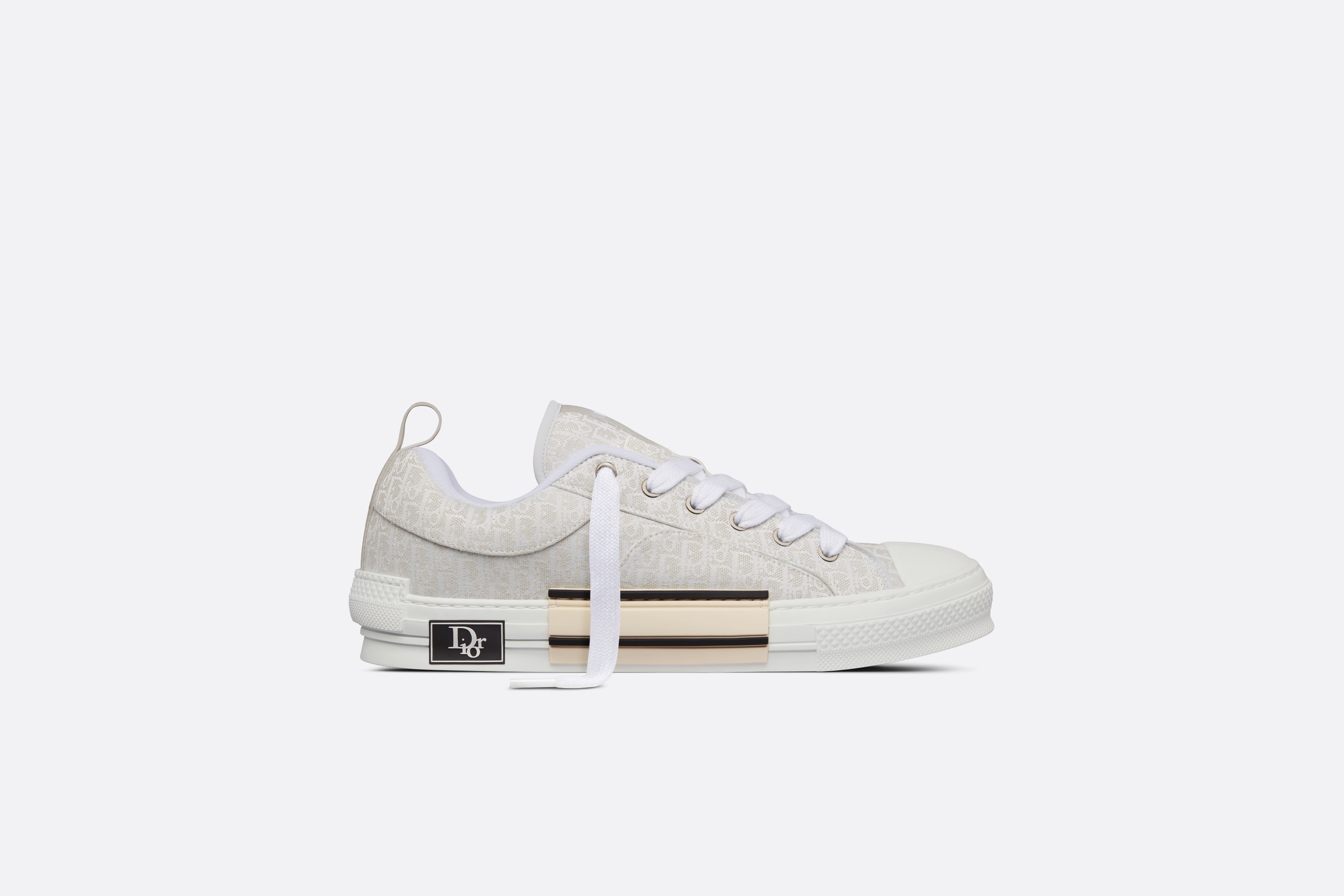 New this season, the B23 skater sneaker offers a new take on an iconic House style with a chunky silhouette and modern allure. Crafted in cream jacquard, it showcases the all-over Dior Oblique motif as well as classic skater shoe codes like thick laces on the front, a padded tongue, reinforced rounded toe and a rear tab. Completed by a white rubber sole enhanced by a Dior Oblique patch, the skater sneaker will pair easily with any casual outfit. - Cream Dior Oblique jacquard - Dior Oblique signature padded tongue - Patchwork-effect sole with Dior Oblique patch on the side - Low-top - Lace-up closure with rear tab - Technical mesh lining - Reinforced white rubber toe and outsole - Welded, side-sewn construction - Dust bag included - Made in Italy Size & Fit - The style fits true to size: we recommend ordering your normal shoe size - For more information, please review the size guide