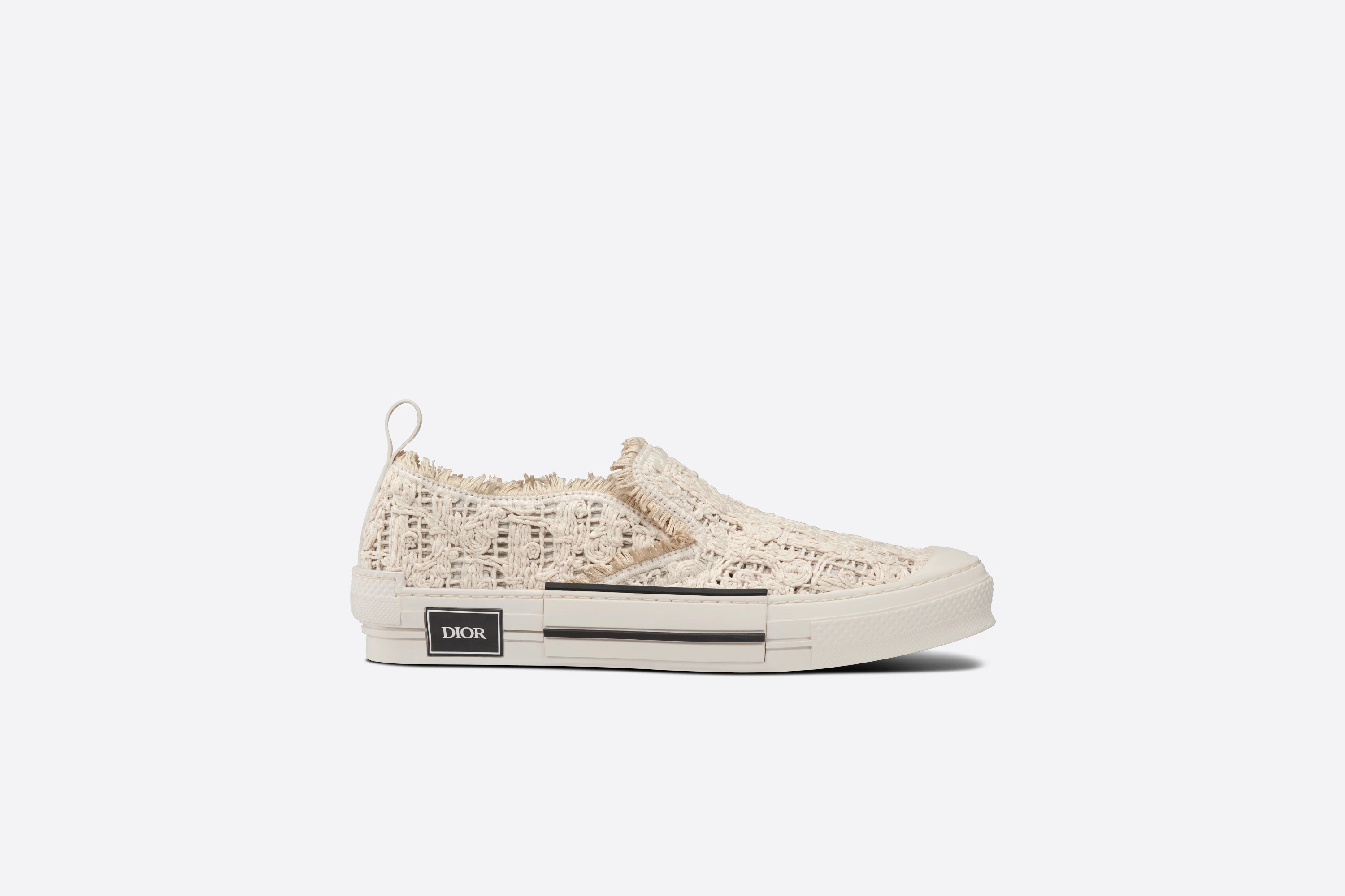 The B23 slip-on sneaker is offered in a cream Dior Oblique Macramé version crafted from embroidered cotton with a Cornely effect that combines modernity and savoir-faire. The design maintains timeless sneaker codes, including elastic bands on the front, a beige rubber sole with the 'DIOR' signature on the side, a rounded and reinforced toe as well as a rear tab. The sneaker can be easily worn with any casual outfit. - Cream Dior Oblique Macramé - Patchwork-effect sole with 'DIOR' signature on the side - Low-top - Slip-on style with rear tab - Microfiber lining - Rubber outsole and reinforced toe with two-tone insert - Welded, side-sewn construction - Dust bag included - Made in Italy Size & Fit - The style fits true to size: we recommend ordering your normal shoe size - For more information, please review the size guide