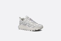 As seen at the Dior Men Summer 2023 fashion show, the season's new low-top B31 Runner shoe is distinguished by its modern silhouette that combines technical expertise with the House's couture spirit. Crafted in white technical mesh, it is enhanced by gray Warped Cannage injected rubber in a futuristic new take on the House's iconic motif. The Dior signature adorns the tongue and front, while eyelets recall a hiking shoe and the CD Diamond drawstring cord accentuate the piece's technical appeal. The thick notched sole in sculpted rubber offers ideal traction, and the reinforced heel guarantees optimal comfort. The B31 Runner sneaker will complete both sportswear and casual outfits alike. - White technical mesh - Warped Cannage motif in gray injected rubber - Reflective Dior signature on the front - Tongue with Dior signature in injected rubber - Low-top - Laces and drawstring cord with CD Diamond cord-stop closure - Reinforced heel and nylon rear pull tab - Calfskin and technical mesh lining - White sculpted rubber outsole with signature - Welded construction - Dust bag included - Made in Italy Size & Fit - The style fits true to size: we recommend ordering your normal shoe size - For more information, please review the size guide