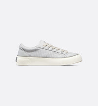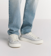 The B33 sneaker is a new take on the timeless tennis shoe with a play on volume in a modern silhouette. Crafted in white smooth calfskin and Dior Oblique jacquard, it is distinguished by a padded tongue revealing the embossed Dior signature, wide white cotton laces and matte-finish tonal brass eyelets. The cream Dior Oblique rubber sole is enhanced by a contrasting Dior 30 Avenue Montaigne signature on the rear. The sneaker will lend a contemporary touch to casual looks. The pair is equipped with a secure NFC chip, placed under the sole of the right foot, which provides access to a platform to obtain its Digital Certificate of Authenticity. Holders of the certificate benefit from news on future collections. - White smooth calfskin - White Dior Oblique jacquard - Dior signature embossed on tongue - Embossed Dior 30 Avenue Montaigne signature on the back - Low-top - Matte-finish brass eyelets with cotton lace-up closure - Padded collar - Rear tab - Leather lining - Cream Dior Oblique rubber sole - Warped Cannage and Dior Oblique motif outsole - Dust bag included - Set of white cotton laces provided - Made in Italy - Limited pair - Digital Certificate of Authenticity Size & Fit - The style fits true to size, we recommend ordering your normal shoe size - Weight: approximately 500 g / 17.5 ounces - For more information, please review the size guide