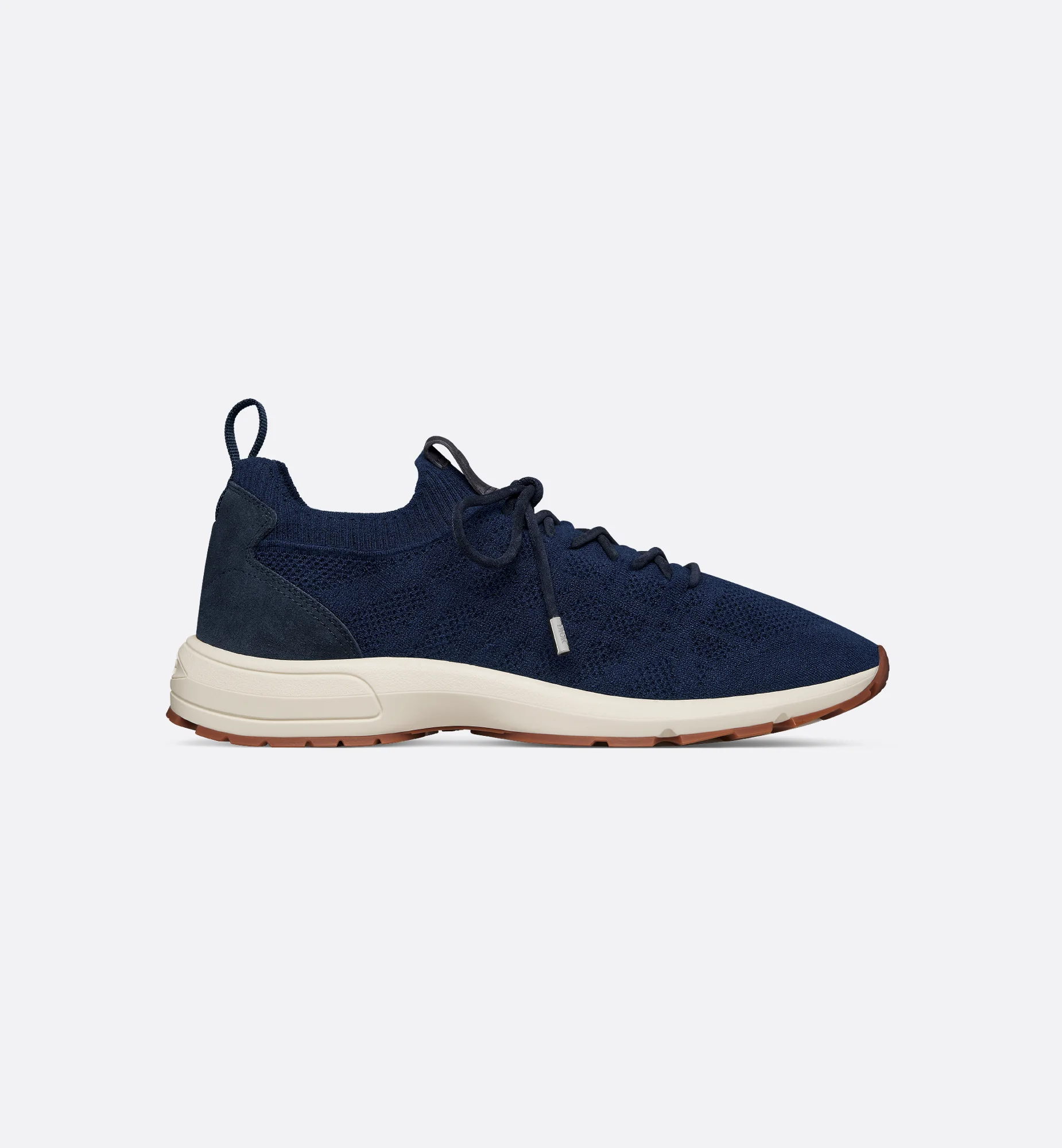 New for Winter 2025, the B80 Lounge sneaker is distinguished by its streamlined silhouette and details inspired by Dior's couture spirit. Crafted in a navy blue cashmere, wool and silk knit subtly showcasing the House's iconic Cannage motif, the style is enhanced by a tonal suede panel in the back and a Dior-embossed patch on the tongue. Combining a lightweight feel with optimal comfort, the design features an elasticated collar, rear tab and decorative suede laces allowing it to slip on easily. Completed by a thick, notched and sculpted rubber sole with the Dior signature, the B80 Lounge sneaker will pair with any look in the Dior Icons capsule. - Main composition: cashmere, wool, silk, suede lambskin and technical fabric - Wool, cashmere, silk and lambskin lining - Tonal Cannage motif - Suede Dior-embossed patch on the tongue - Dior signature engraved on the heel - Low top - Slip-on style - Decorative suede laces with Dior-engraved metal tips - Rear tab - TPU insole - White and amber sculpted rubber outsole with Dior signatures - Welded construction - Dust bag included - Made in Italy Size & Fit - Weight: 460 g / 16 ounces - Weight details may vary depending on the product's material - Using our personalized tool will provide you with the best size recommendation - For more information, please review the size guide