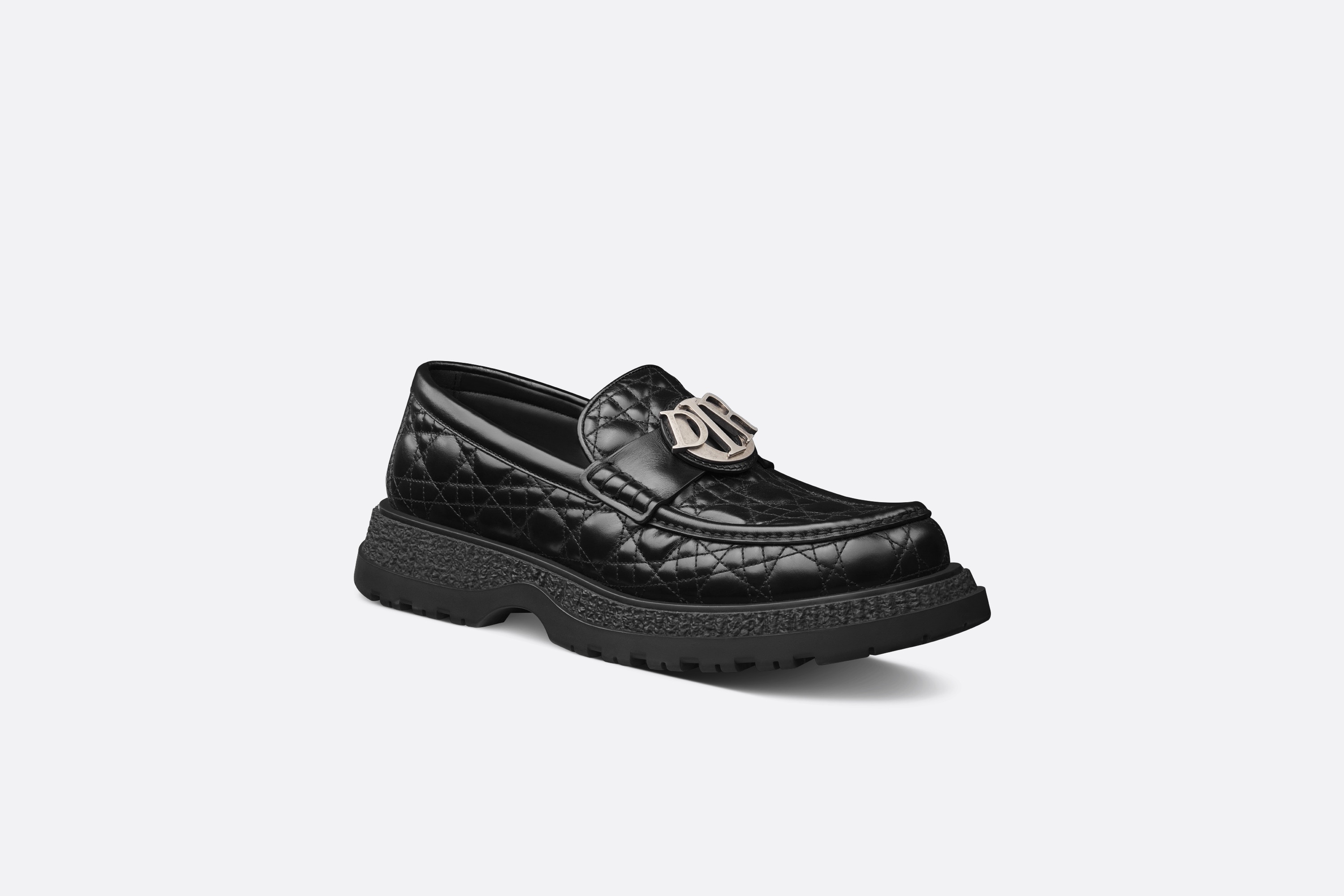 The Dior Buffalo loafer stands out with its modern appeal. Crafted in black Cannage Kumo leather, it offers a quilted version of the hallmark motif, while the chunky rubber sole provides a new take on the crepe sole. Completed by an antique ruthenium-finish brass Dior Charm buckle, the shoe will add a contemporary touch to any seasonal look. - Black Cannage Kumo leather - Antique ruthenium-finish brass Dior Charm buckle - Low-top - Pull-on style - Crepe-effect rubber outsole with Dior signature - Welded construction - Leather lining - Dust bag included - Made in Italy Size & Fit - The style fits large, we recommend ordering half a size smaller than your normal size - Weight: approximately 670 g / 23.5 ounces - Using our personalized tool will provide you with the best size recommendation - For more information, please review the size guide
