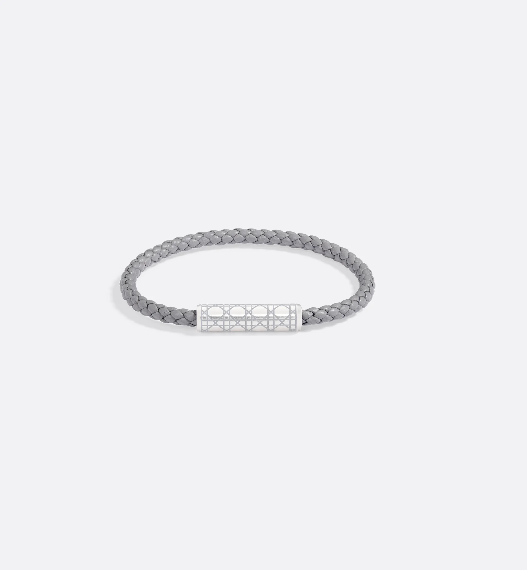 New for Fall 2025, the bracelet has a refined look that subtly conveys House codes. The gray woven lambskin cord is enhanced by a silver-finish brass magnetic clasp engraved with the Cannage motif in gray lacquer. The bracelet can be coordinated with other Cannage creations in the collection. - Engraved Cannage motif in gray lacquer - Silver-finish brass - Dior signature detail engraved in gray lacquer on the back - Magnetic clasp - 70% lambskin, 25% brass, 5% resin - Made in Germany Size & Fit - Three sizes available: S (18 cm / 7 inches), M (19 cm / 7.5 inches) and L (21 cm / 8.25 inches)