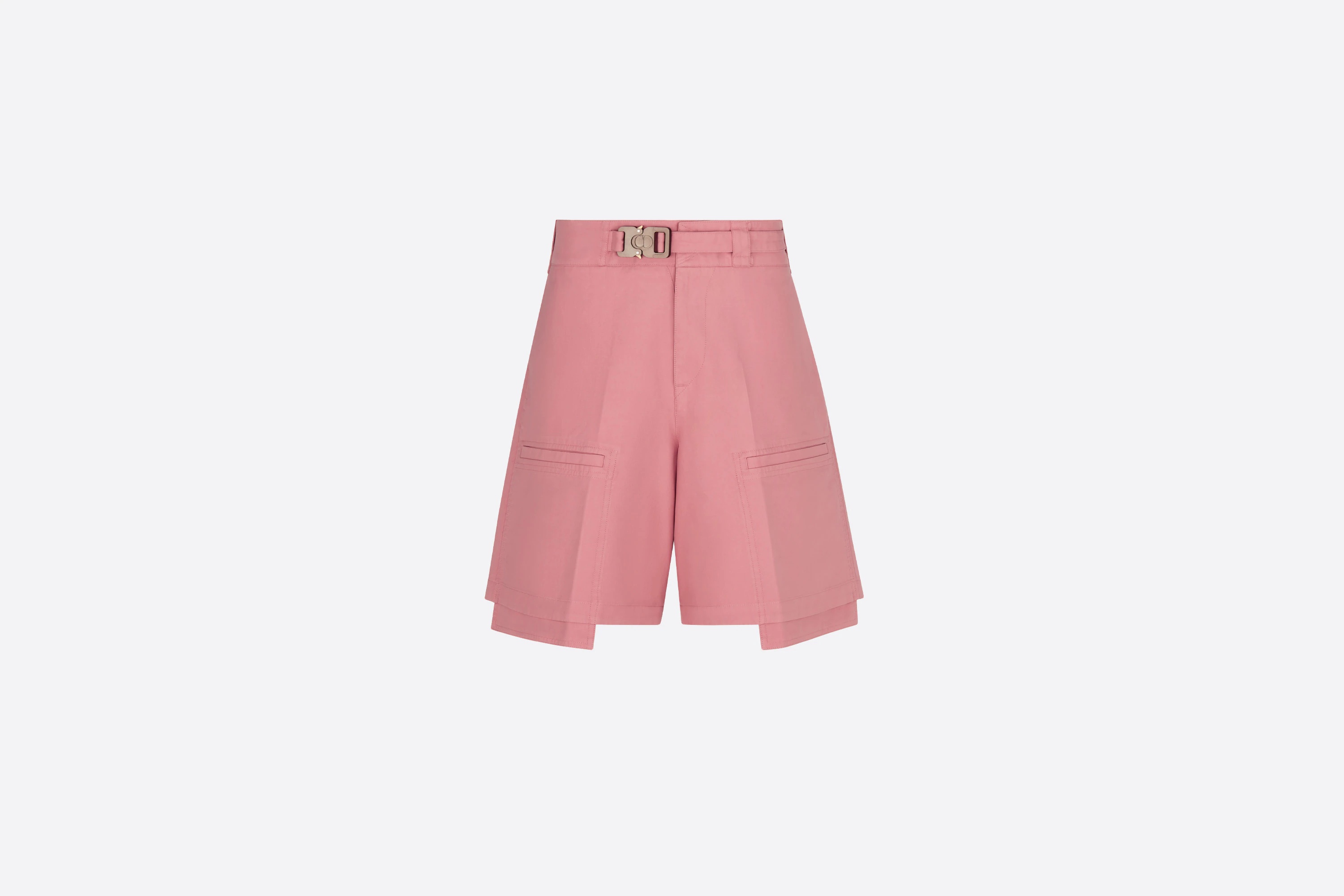The Bermuda cargo shorts, crafted in pink cotton faille, are distinguished by their vintage-effect fading. Enhanced by gusseted pockets, the style also boasts a metal 'CD' buckle belt highlighting the waist with a utilitarian touch. Featuring a refined aesthetic, the Bermuda shorts can be worn with T-shirts and sweaters from the collection. - Brown metal 'CD' buckle belt - Faded vintage effect - Zipped closure with engraved 'DIOR' signature on the pull - Gusseted exposed pockets on the front - Side slit pockets - Gusseted flap pocket on the back - 100% cotton - Made in Italy Size & Fit - Mid-rise waist - Side length: 47 cm / 18.5 inches (size 48) - For more information, please review the size guide