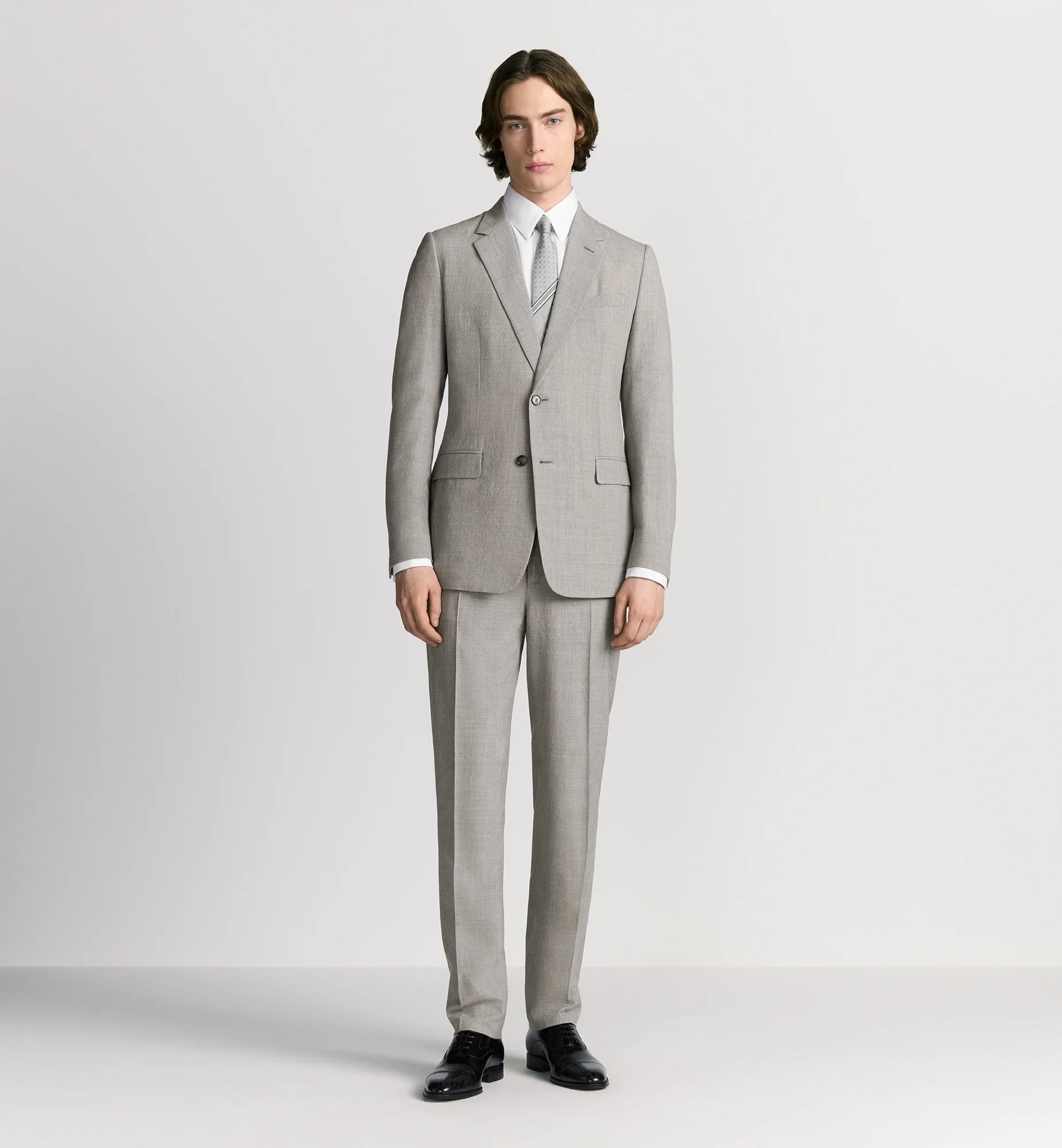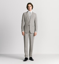 Tailoring is quintessential Dior atelier savoir-faire and lies at the heart of House heritage. Celebrating this unique expertise, Kim Jones, Creative Director of Dior Men, reimagines the codes of elegance of the classic suit. Crafted in gray virgin wool-blend seersucker with traditional interfacing, the suit is ideal for all seasons. The single-breasted jacket is distinguished by a modern and sophisticated fit with an elegant drape, while the classic-fit pants are enhanced by a crease along the leg, lending structure to the silhouette. The suit can be completed by a shirt and tie for a more refined look, or worn with a thin cashmere sweater and sneakers for a more contemporary style. - Jacket: - Notch lapels - Traditional interfacing - Handstitched details - Single-breasted, two-button closure and lapel buttonhole - Dior-engraved horn buttons - Chest pocket and side flap pockets - Half lined - Lining - Rear vent - Pants: - Belt loops - Creases - Zipper and hook-and-bar fastening - Side slit pockets and rear piped pockets - 98% virgin wool, 2% elastane and lining 100% cupro - Made in Italy Size & Fit - Classic-fit jacket - Back length: 75 cm / 29.5 inches (size 48R) - Regular-fit pants - Leg opening: 19 cm / 7.5 inches (size 48R) - The model measures 189 cm / 74.5 inches and the item shown is in size 48R (FR) - Using our personalized tool will provide you with the best size recommendation - For more information, please review the size guide