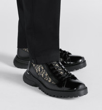 New for Spring 2024, the Dior Combat ankle boot presents a hybrid, modern and athletic silhouette. The black polished calfskin style is embellished with beige and black Dior Oblique jacquard inserts on the sides and on the tongue. The shoe features laces and a technical zip closure, while the lightweight hybrid sole accentuates its couture appeal. Enhanced by the Dior signature on the side and a padded collar for added comfort, the shoe will add a contemporary touch to all of the season's looks. - Black polished calfskin with beige and black Dior Oblique jacquard - Contrasting Dior signature on the side - High upper with padded collar - Lace-up closure with Dior technical zip - EVA hybrid outsole with engraved Dior Oblique motif - Calfskin lining - Welded construction - Dust bag included - Made in Italy Size & Fit - The style fits true to size, we recommend ordering your normal shoe size - Weight: approximately 460 g / 16 ounces - For more information, please review the size guide