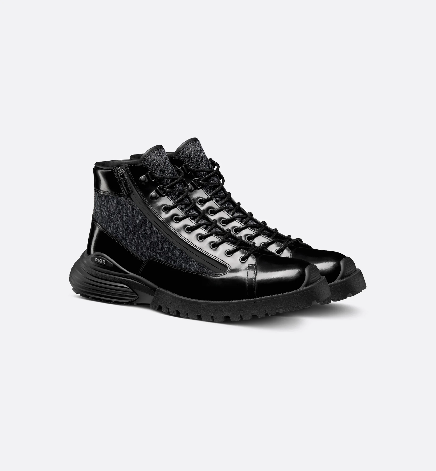 New for Spring 2024, the Dior Combat ankle boot presents a hybrid, modern and athletic silhouette. The black polished calfskin style is embellished with Dior Oblique jacquard inserts on the sides and tongue. The shoe features laces and a technical zip closure, while the lightweight hybrid sole accentuates its couture appeal. Enhanced by the Dior signature on the side and a padded collar for added comfort, the shoe will add a contemporary touch to all of the season's looks. - Black polished calfskin and Dior Oblique jacquard - Contrasting Dior signature on the side - High upper with padded collar - Lace-up closure with Dior technical zip - EVA hybrid outsole with engraved Dior Oblique motif - Calfskin lining - Welded construction - Dust bag included - Made in Italy Size & Fit - The style fits true to size, we recommend ordering your normal shoe size - Weight: approximately 460 g / 16 ounces - For more information, please review the size guide