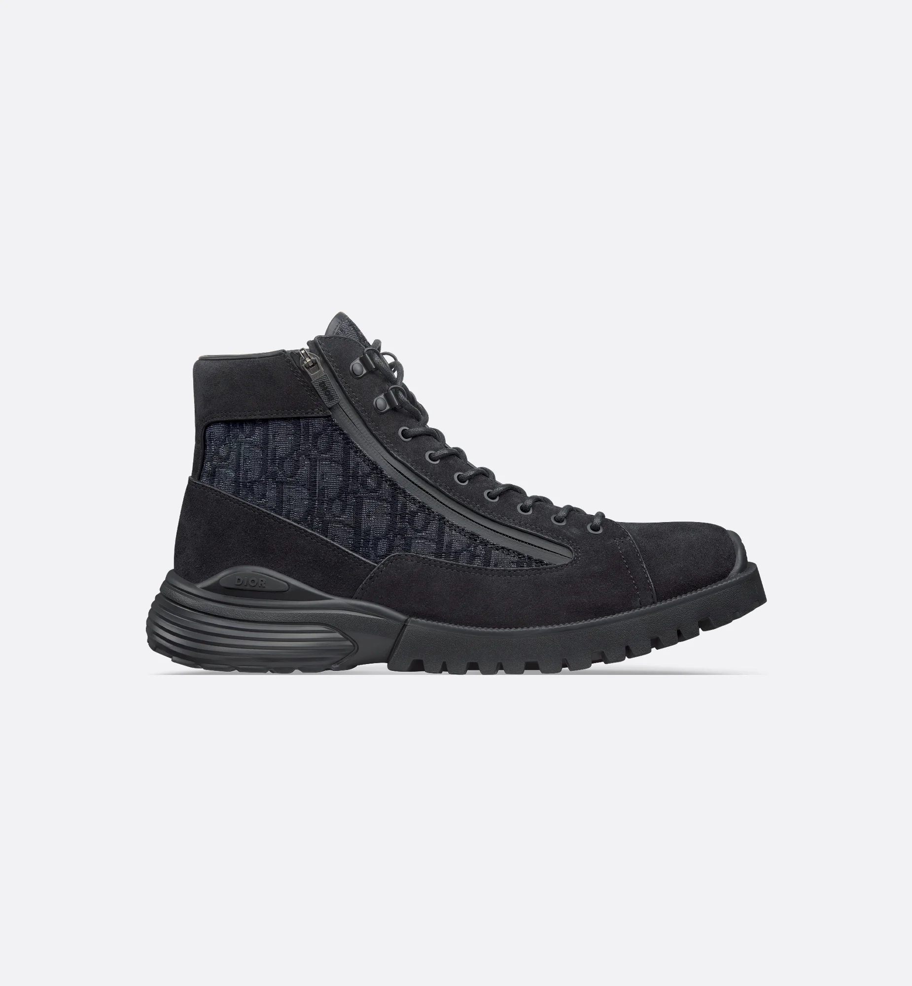 The Dior Combat ankle boot presents a hybrid, modern and athletic silhouette. The black suede style is embellished with tonal Dior Oblique jacquard panels on the sides and tongue. The shoe features laces and a technical zip closure, while the lightweight hybrid sole accentuates its couture appeal. Enhanced by the Dior signature on the side and a padded collar for added comfort, the shoe will lend a contemporary touch to all of the season's looks. - Main composition: suede calfskin, calfskin and cotton - Calfskin lining - Tonal Dior signature on the side - High upper with padded collar - Lace-up closure with Dior technical zip - EVA hybrid outsole with engraved Dior Oblique motif - Welded construction - Dust bag included - Additional set of laces provided - Made in Italy Size & Fit - The style fits true to size, we recommend ordering your normal shoe size - Using our personalized tool will provide you with the best size recommendation - For more information, please review the size guide