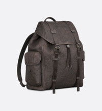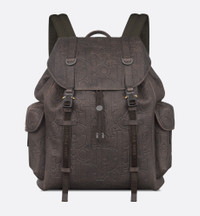 The Dior Hit the Road backpack with flap offers a modern take on the House's couture spirit. Displaying the virtuosity of the Dior ateliers, the Dior Gravity Vintage leather showcases the iconic motif delicately embossed on brown calfskin with an aged effect, lending a unique appearance. Accented by the Dior signature on the front, it has a flap with tonal CD aluminum mini buckles and two Christian Dior nylon jacquard straps, as well as a spacious main compartment and two side pockets with magnetic flaps. The practical backpack will add the finishing touch to casual outfits. - Main composition: technical fabric and calfskin - Technical fabric, cotton and calfskin lining - Main compartment with flap and drawstring cord - Tonal CD aluminum mini buckles and D-rings - Interior flat compartment for laptop - Magnetic side flap pockets - Leather top handle - Adjustable padded shoulder straps - Padded mesh back with Dior signature - Ruthenium-finish brass Dior signature on the front - Embossed Dior signature on the interior - Dust bag included - Made in Italy Size & Fit - Dimensions: 43 x 43 x 18 cm / 17 x 17 x 7 inches (Length x Height x Width) - The main compartment's size is suitable for a 15-inch laptop computer, A4 documents and a tablet - The size of the side pockets is suitable for all phone models - Size and weight details may vary depending on the product's material