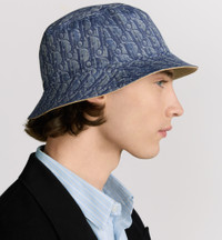 The bucket hat revisits an essential piece from the streetwear universe in keeping with the House's couture spirit. The reversible design has one solid beige cotton canvas side with an embroidered Dior signature, while the other side features light blue Dior Oblique cotton twill, inspired by ancestral Japanese weaving techniques. The modern bucket hat will elevate any casual look and can be paired with other pieces from the collection. - Reversible solid beige and light blue allover Dior Oblique print - Contrasting Dior embroidery on the side - 100% cotton and lining: 71% cotton, 29% polyester - Made in Italy Size & Fit - The bucket hat size corresponds to the head's circumference in cm / inches - Four sizes available: S (58 cm / 23 inches), M (59 cm / 23 inches), L (60 cm / 23.5 inches) and XL (61 cm / 24 inches)