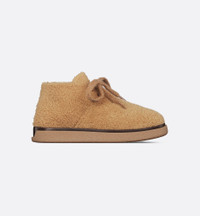 New for Spring 2025, the Dior Sahara chukka boot offers a new take on a timeless style with the House's couture codes. The chunky silhouette is distinguished by a beige shearling upper and tonal mohair laces. The contemporary shoe is completed by a sole in beige crepe-effect rubber and brown leather with an engraved signature on the heel. The chukka boot will add the finishing touch to any of the season's casual looks. - Main composition: wool, brass and mohair - Calfskin lining - Dior signature engraved on the heel - High top - Mohair lace-up closure - Crepe-effect outsole in beige rubber and brown leather with engraved Cannage motif - Tubular construction - Dust bag included - Made in Italy Size & Fit - The style fits true to size, we recommend ordering your normal shoe size - Using our personalized tool will provide you with the best size recommendation - For more information, please review the size guide