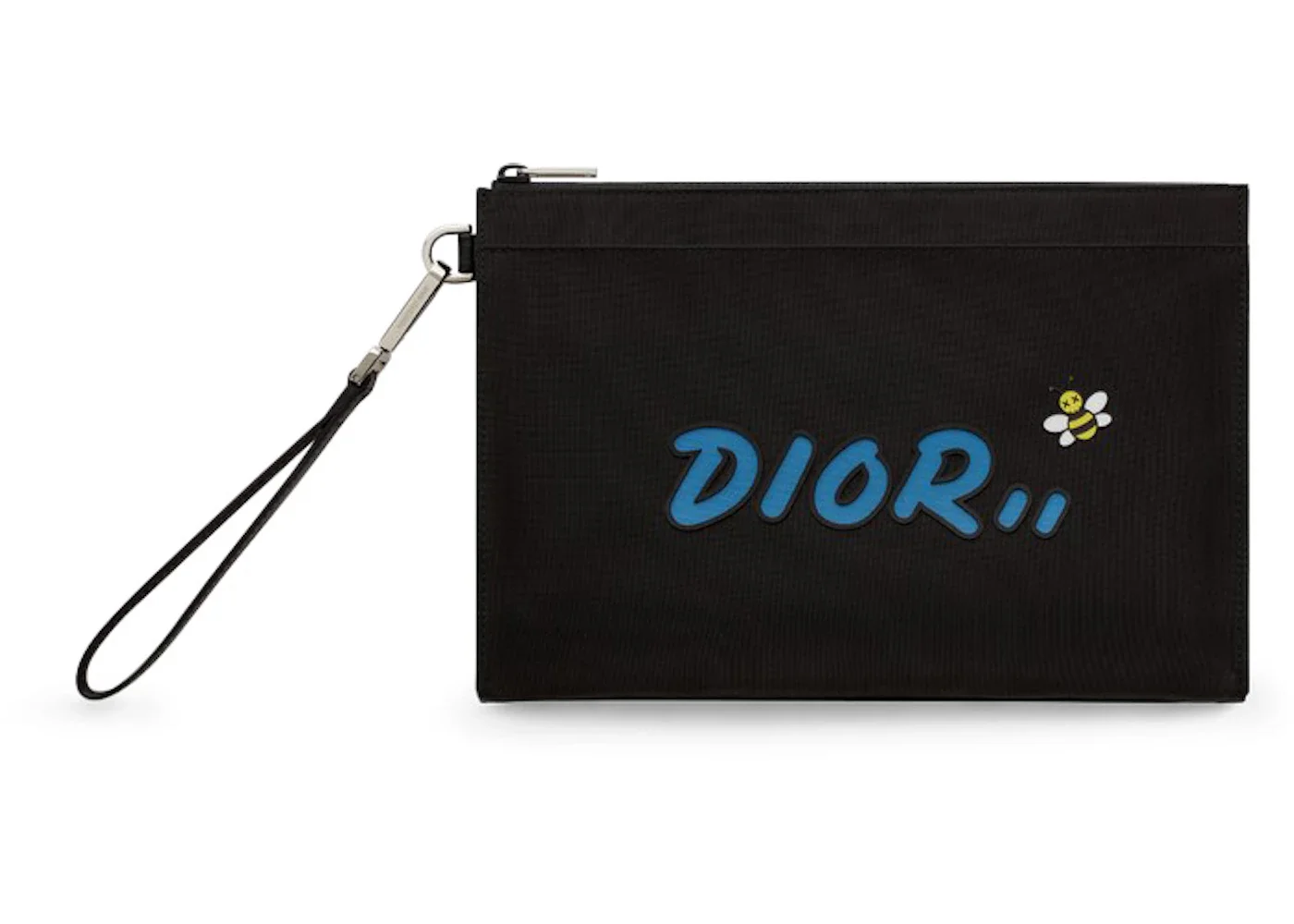 Part of the Dior x Kaws SS19 collection, this wristlet is the perfect accessory for when you’re wanting to just carry the essentials. This design features a blue Dior logo and Kaws-style bee illustration against a black nylon material. Silver-tone hardware covers metal pieces including the exterior zipper.Please Note: This item comes with a dust bag, the box is not required. - Dimensions 8H 12W - Material Nylon - Retail Price 900 - Color Black - Hardware Silver-tone - Style 2KWCA143YLE_H03E - Base Model Pouch - Base Model Variety x Kaws - Color Generic Black - Exterior Variant Nylon - Featured false - Height 8 - Interior Color Black - Pattern Blue Logo - Styles Pouch - Width 12