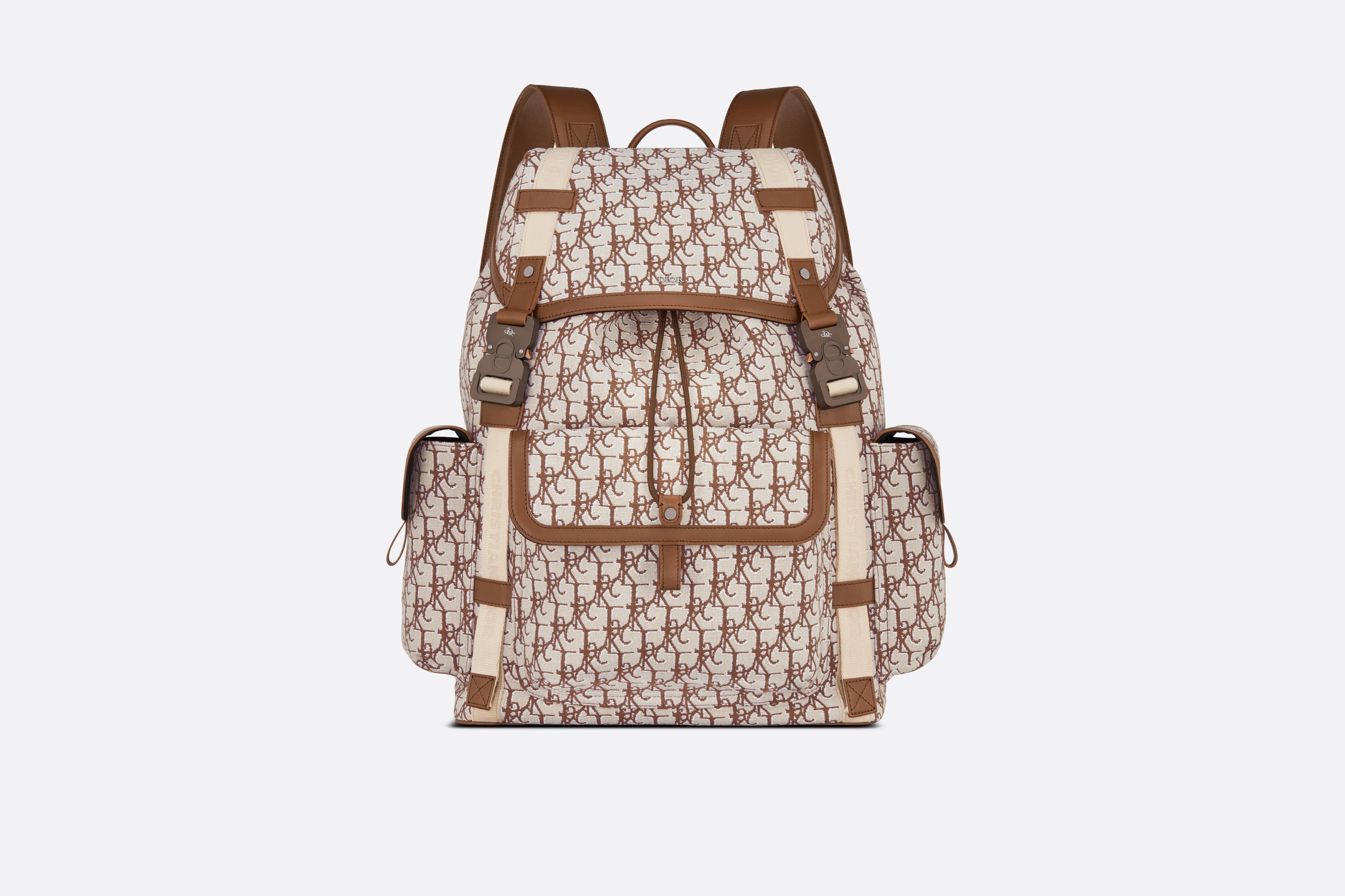 The Dior Hit The Road Backpack is a new style this season from the exclusive collaboration with CACTUS JACK. The style is crafted in coffee Cactus Jack Oblique jacquard, a reinterpretation of the hallmark House motif. Adorned in smooth calfskin details, the backpack features two 'CHRISTIAN DIOR' nylon jacquard bands, a spacious main compartment, a large flap pocket on the front and two flap pockets on the sides. The practical backpack will lend the finishing touch to all casual outfits. - Coffee Cactus Jack Oblique jacquard - Coffee smooth calfskin - Ruthenium-finish brass 'DIOR' signature on front - Embossed CACTUS JACK DIOR signature on interior - 'CHRISTIAN DIOR' nylon jacquard bands - Flap and drawstring closure - Aluminum buckles with CACTUS JACK DIOR signature and 'CD' initials - Adjustable shoulder straps in leather and padded technical mesh - Leather handle - Padded technical mesh-reinforced back with 'DIOR' signature - Front pocket and side flap pockets - Dust bag included - Made in Italy Size & Fit - Dimensions: 43 x 51 x 20 cm / 17 x 20 x 8 inches - The main compartment's size is suitable for a 15-inch laptop computer, documents and a tablet - The side pockets are ideal for an iPhone 12 Pro Max