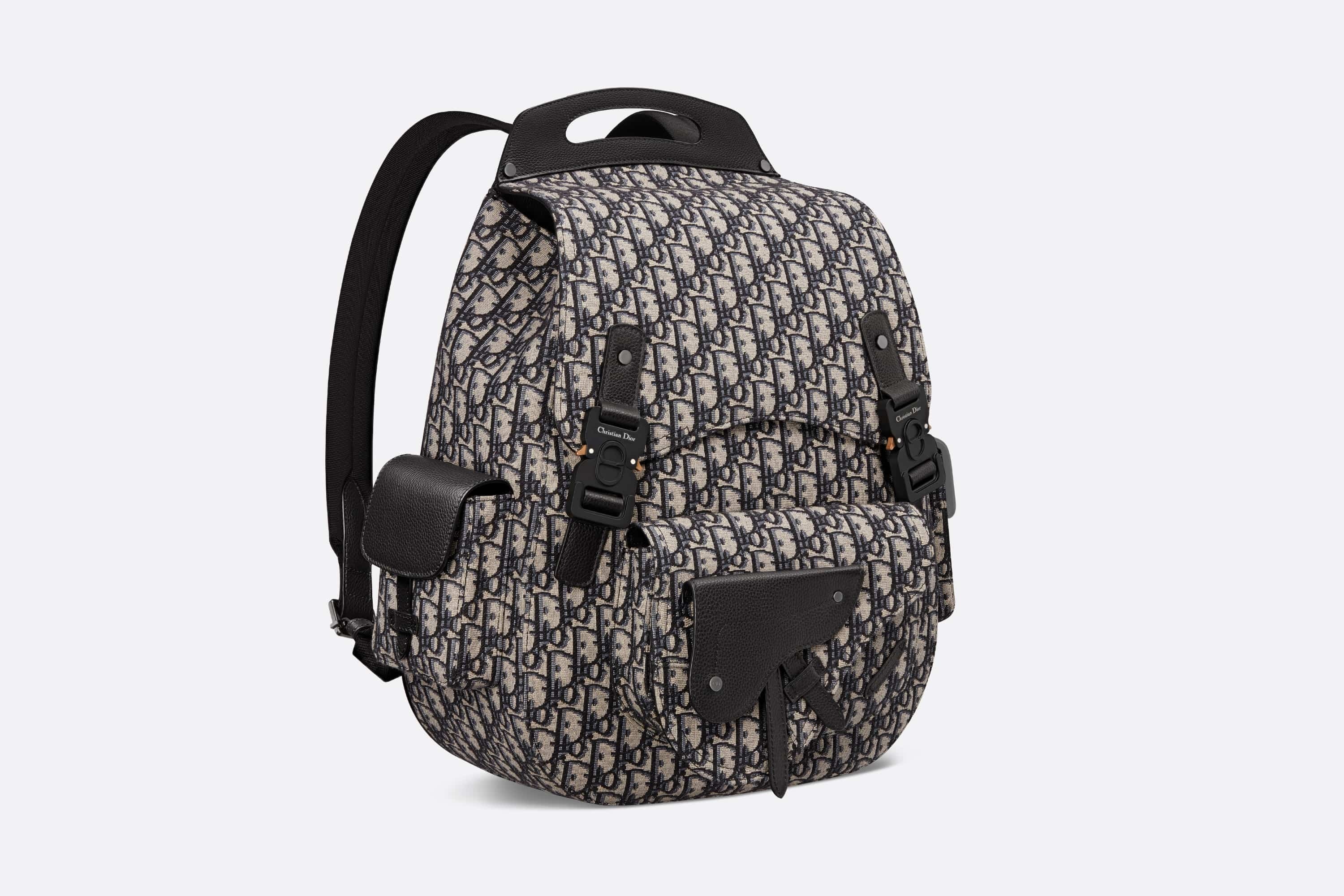 The Maxi Gallop backpack offers a modern and original take on the iconic Saddle codes. Crafted in beige and black Dior Oblique jacquard, it is embellished with black grained calfskin details and aluminum buckles with the Christian Dior signature. The main compartment can hold all the essentials, while the front Saddle pocket and side flap pockets offer easy access to keys or headphones. The practical, maxi backpack will lend the finishing touch to any outfit. - Beige and black Dior Oblique jacquard - Black grained calfskin - Embossed Dior signature on interior - Adjustable grained calfskin shoulder straps - Rigid top handle - Two aluminum buckles with Christian Dior signature and CD letters on flap closure - Front Saddle flap pocket - Two side patch pockets on both sides - Interior patch pocket - Dust bag included - Made in Italy Size & Fit - Dimensions: 33 x 47 x 13.5 cm / 13 x 18.5 x 5.5 inches - The main compartment's size is suitable for a 15-inch laptop, iPad Pro and A4 documents