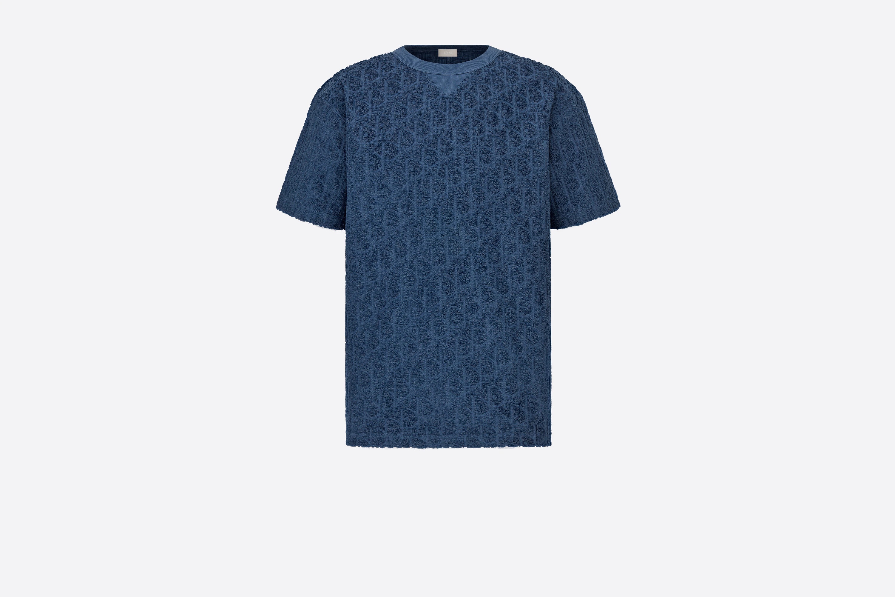 The blue terry cotton T-shirt pays tribute to the hallmark Dior Oblique motif with a tonal jacquard. The ribbed round neckline has a V-topstitching detail for a casual effect. The relaxed T-shirt may be paired with jeans or track pants for an elevated look. - All-over tonal Dior Oblique jacquard - Ribbed round neck with V-neck topstitching - 100% cotton - Made in Italy Size & Fit - Relaxed fit - This item is designed for a slightly loose fit – we recommend ordering your regular size - Back length: 75 cm / 29.5 inches (size M) - For more information, please review the size guide