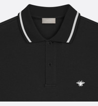 The black polo shirt is adorned with an embroidered hallmark bee on the chest. Crafted in cotton pique, it has thin contrasting bands on the collar and sleeve cuffs. The polo shirt can be paired with other Dior Essentials creations for a timeless look. - White bee embroidery on the chest - Ribbed polo shirt collar and cuffs white stripes - Mother-of-pearl Dior buttons - 100% cotton - Made in Italy Size & Fit - Regular fit - Size XXS: shoulder-to-shoulder width: 40 cm / 15.5 inches, chest size: 90 cm / 35.5 inches, outside and inside sleeve lengths: 18 and 6 cm / 7 and 2.5 inches, garment length: 67 cm / 26.5 inches - Size XS: shoulder-to-shoulder width: 41 cm / 16 inches, chest size: 94 cm / 37 inches, outside and inside sleeve lengths: 18.5 and 6.5 cm / 7.5 and 2.5 inches, garment length: 68 cm / 27 inches - Size S: shoulder-to-shoulder width: 42 cm / 16.5 inches, chest size: 98 cm / 38.5 inches, outside and inside sleeve lengths: 19 and 7 cm / 7.5 and 3 inches, garment length: 69 cm / 27 inches - Size M: shoulder-to-shoulder width: 43 cm / 17 inches, chest size: 102 cm / 40 inches, outside and inside sleeve lengths: 19.5 and 7 cm / 7.5 and 3 inches, garment length: 70 cm / 27.5 inches - Size L: shoulder-to-shoulder width: 44 cm / 17.5 inches, chest size: 106 cm / 41.5 inches, outside and inside sleeve lengths: 20 and 8 cm / 8 and 3 inches, garment length: 71 cm / 28 inches - Size XL: shoulder-to-shoulder width: 45 cm / 17.5 inches, chest size: 110 cm / 43.5 inches, outside and inside sleeve lengths: 20.5 and 8.5 cm / 8 and 3.5 inches, garment length: 72 cm / 28.5 inches - Size XXL: shoulder-to-shoulder width: 46 cm / 18 inches, chest size: 114 cm / 45 inches, outside and inside sleeve lengths: 21 and 9 cm / 8.5 and 3.5 inches, garment length: 73 cm / 28.5 inches - Size 3XL: shoulder-to-shoulder width: 47 cm / 18.5 inches, chest size: 118 cm / 46.5 inches, outside and inside sleeve lengths: 21.5 and 9 cm / 8.5 and 3.5 inches, garment length: 74 cm / 29 inches - Each measurement may have a normal variation of 2 cm / 0.75 inch - Using our personalized tool will provide you with the best size recommendation - For more information, please review the size guide