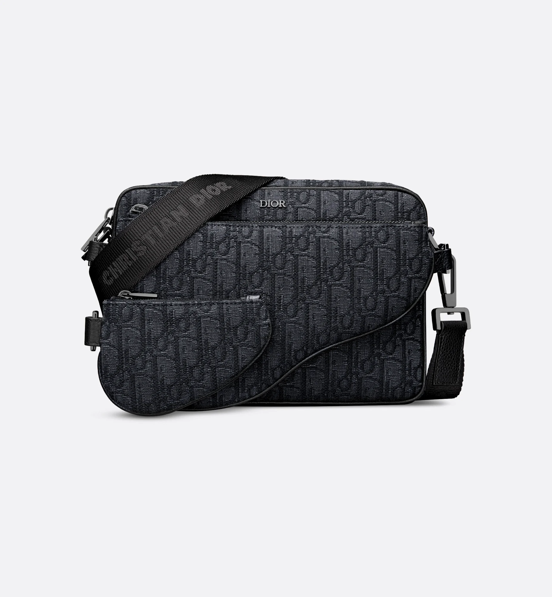 The Saddle Triple Pouch presents a bold and versatile design in black Dior Oblique jacquard. The three-in-one style features a main zip compartment that has a Saddle pouch on the front and nano Saddle pouch, both removable. An adjustable and removable strap allows the practical pouch to be worn over the shoulder or crossbody. - Main composition: cotton, technical fabric and calfskin - Technical fabric, cotton and calfskin lining - Main zip compartment - Removable zip Saddle pouch on the front - Adjustable and removable Christian Dior nylon jacquard shoulder strap with removable Saddle zip nano pouch and lobster clasps - Ruthenium-finish brass Dior signature on the front - Embossed Dior signature on the interior - Dust bag included - Made in Italy Size & Fit - Dimensions: 23 x 16 x 4 cm / 9 x 6.5 x 1.5 inches (Length x Height x Width) - The size is suitable for all phone models - Strap length: 87 – 126 cm / 34.5 – 49.5 inches - Drop length: 38 – 59 cm / 15 – 23 inches - Weight: 575 g / 20.5 ounces