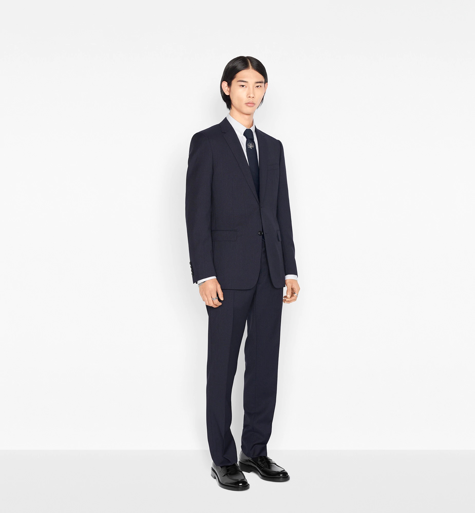 The blue two-button suit is crafted from jasper-effect wool canvas. The jacket is tailored with notch lapels, and the straight-fit pants are cut with a mid-rise waist and finished with press pleats. The suit pairs well with dress shirts and cashmere knits.<br /><br /><ul><li>Notch lapels</li><li>Traditional interfacing</li><li>Hand-stitched details</li><li>Two-button fastening</li><li>'DIOR' signature horn buttons</li><li>Chest pocket and flap side pockets</li><li>Signature stripe-lined sleeves</li><li>'CD' jacquard lining</li><li>Side vent</li><li>Back length: 75 cm/29.5" (size 48R)</li><li>Regular-fit pants with belt loops</li><li>Zip and hook fastening</li><li>Slip side pockets and jetted back pockets</li><li>19 cm/7.5" hem (size 48R)</li><li>100% virgin wool; lining 100% cupro</li><li>Made in Italy</li></ul><br />