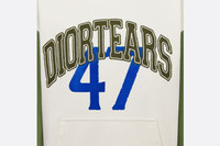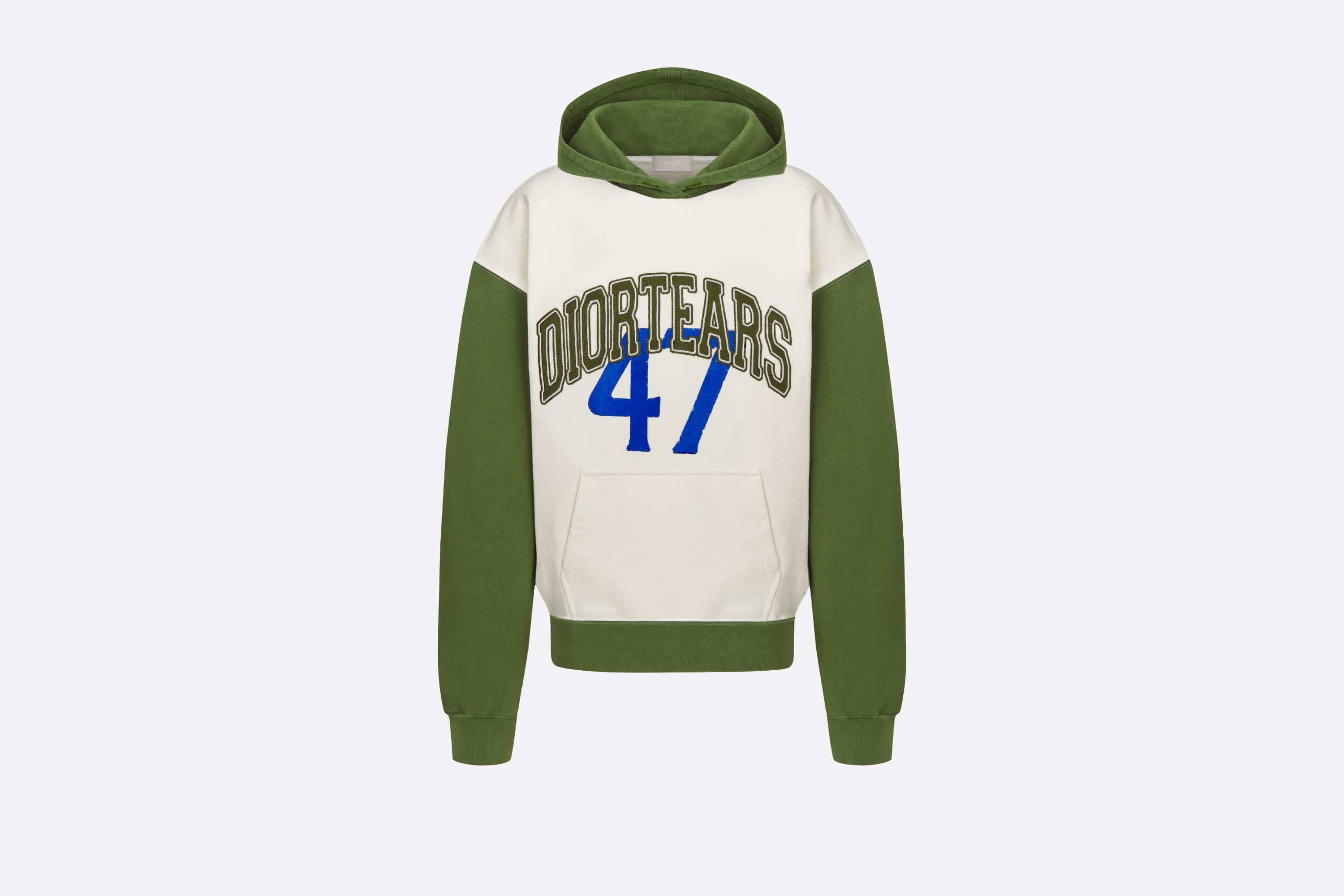 Part of the DIOR TEARS collaboration, the hooded sweatshirt is distinguished by its modern appeal inspired by the American collegiate aesthetic. Crafted in white and green thick cotton fleece, it is enhanced by a Dior Tears signature along with the number 47, referencing the House's very first collection. This creation is characterized by its oversized T-shirt style silhouette with contrasting sleeves and ribbed finishes for additional comfort. The hooded sweatshirt can pair with seasonal pants or shorts for casual attire. *Global Organic Textile Standards - Dior Tears signature and 47 on the front - Hooded - Ribbed cuffs and hem - Contrasting sleeves - Front kangaroo pocket - 100% GOTS*-certified cotton - Made in Italy Size & Fit - Oversized fit - This item is designed for a loose fit with a dropped shoulder – we recommend ordering your regular size - Back length: 71 cm / 28 inches (size M) - For more information, please review the size guide