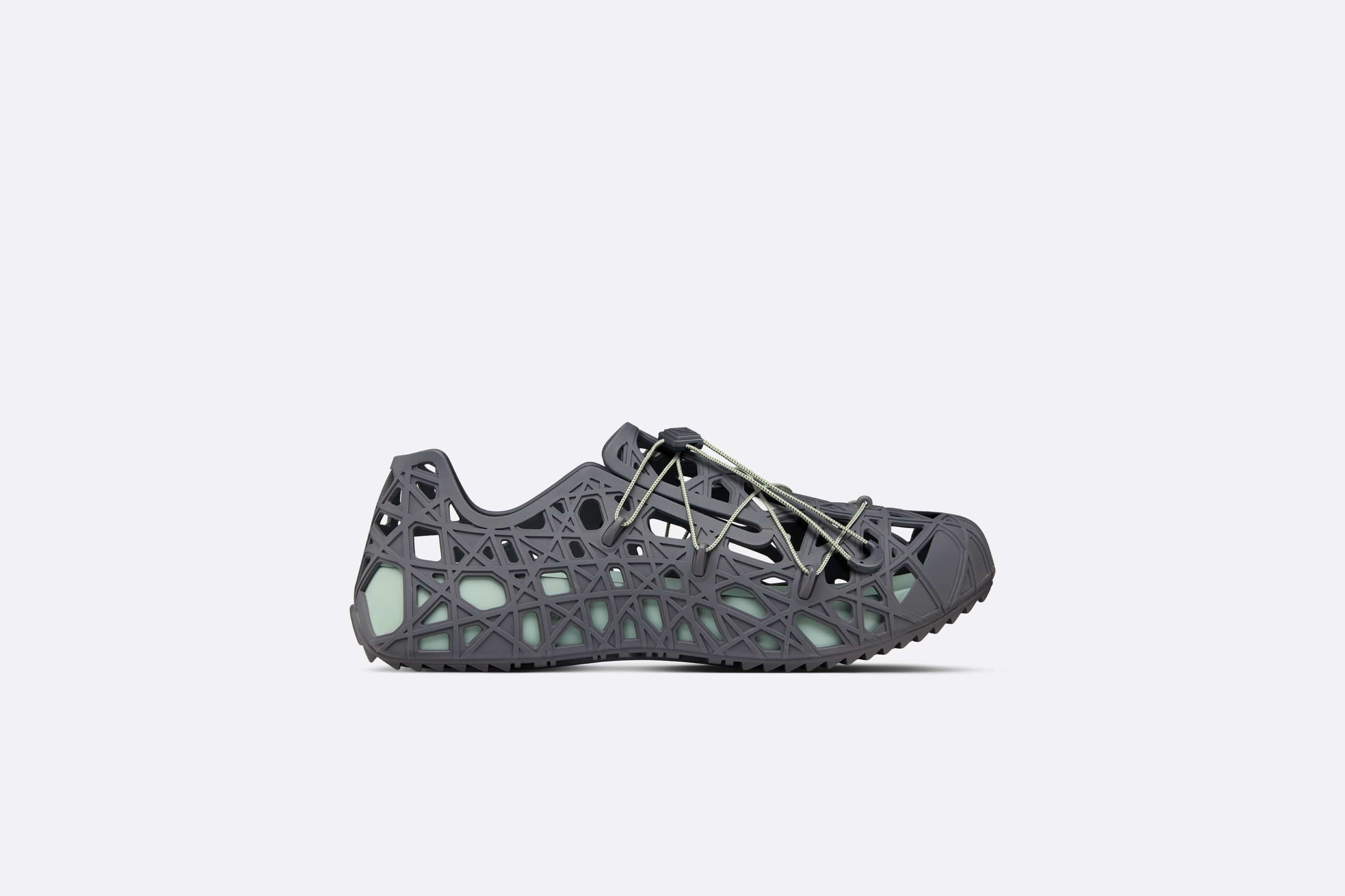 As seen at the Dior Men Summer 2023 fashion show, the Dior Warp sandal showcases a casual silhouette reframed with futuristic spirit. Crafted in ultra-lightweight anthracite gray Cosmo rubber, it reveals the Warped Cannage motif in a reinterpretation of the iconic House pattern. In a play on transparency and subtle contrast, the openwork style reveals a mint green rubber insole. A drawstring cord closure enhanced by technical eyelets and a CD Diamond cord stop accentuates the sportswear spirit of this creation, which can complete any casual attire this season. - Anthracite gray Cosmo rubber with Warped Cannage motif - Low-top - Drawstring cord with CD Diamond cord-stop closure - Mint green rubber insole - Sculpted rubber Cannage outsole - Welded construction - Made in Italy - Presented in a Dior Warp box and a dust bag matching the sandal - One pair of socks included Size & Fit - The style fits large to size: we recommend ordering a size smaller than your normal size - For more information, please review the size guide