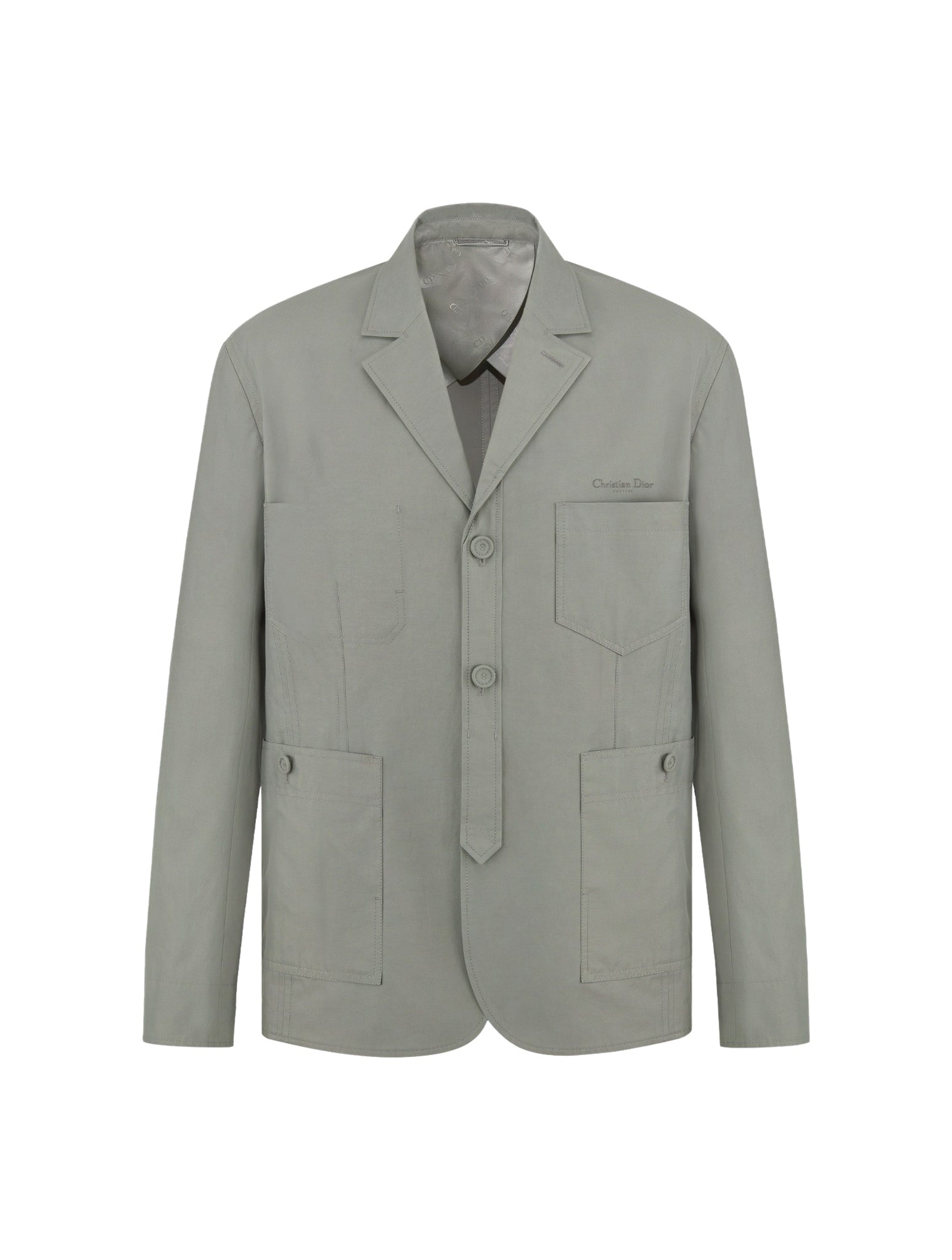 -Christian Dior Couture embroidery -Tone-on-tone stitching -Classic lapels -Single-breasted model with fabric-covered buttons -Side pockets with buttons and patch pocket on the chest -Half lining Made in Italy Composition: Cotton 59% Cotton 41% polyamide Color code: 800 GRIS 383C257A6107