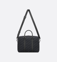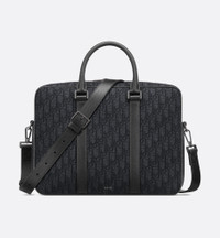 The briefcase pairs timeless elegance with the House's couture spirit. The rigid silhouette is crafted in black Dior Oblique jacquard enhanced by tonal grained calfskin detailing and the Dior signature on the front, while the zip closure reveals a spacious interior that can accommodate a laptop. Folding handles and an adjustable and removable strap allow the bag to be carried by hand, worn over the shoulder or crossbody. - Main composition: cotton, calfskin and technical fabric - Technical fabric, cotton and calfskin lining - Main zip compartment - Interior flat compartment for laptop - Two interior slip pockets - Leather top handles - Adjustable and removable leather shoulder strap with lobster clasps - Ruthenium-finish brass Dior signature on the front - Embossed Dior signature on the interior - Dust bag included - Made in Italy Size & Fit - Dimensions: 37 x 28 x 6 cm / 14.5 x 11 x 2.5 inches (Length x Height x Width) - The main compartment's size is suitable for a 13-inch laptop computer, A4 documents and a tablet - Weight: 1.328 kg / 3 pounds