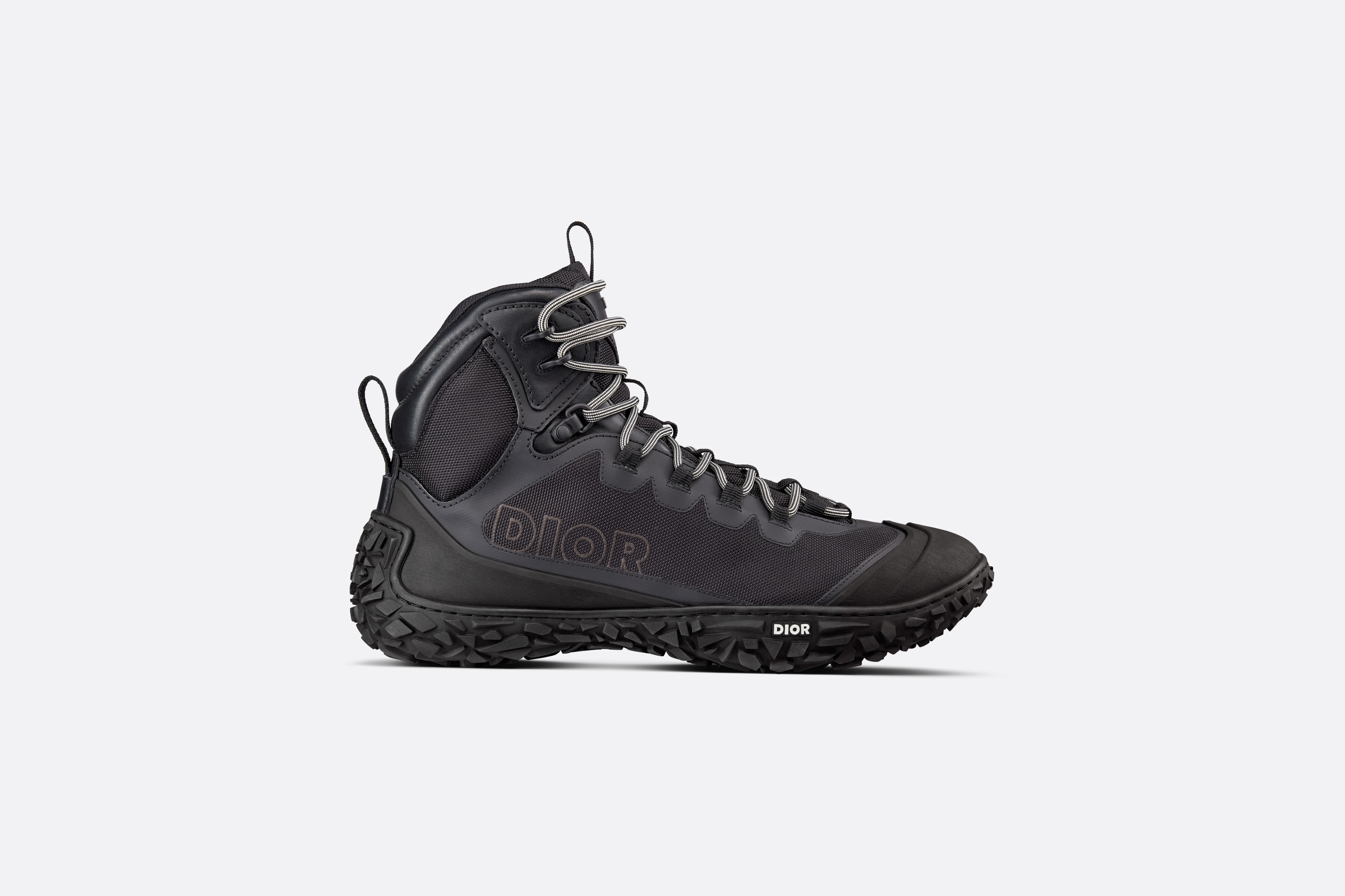 New this season, the Diorizon hiking boot combines technical savoir-faire with couture appeal. Crafted in black technical mesh, it features tonal rubber detailing, a 'DIOR' signature on the side as well as padded inserts which ensure optimal comfort. Completed by a uniquely contoured 'DIOR' black rubber sole, the hiking boot will lend a modern touch to any casual outfit. - Black technical mesh and rubber - 'DIOR' signature on the side, sole and tongue - High-top - Two-tone lace-up closure with back tab - Black rubber outsole - Side-sewn construction - Dust bag included - Made in Italy Size & Fit - The style fits true to size: we recommend ordering your normal shoe size - For more information, please review the size guide